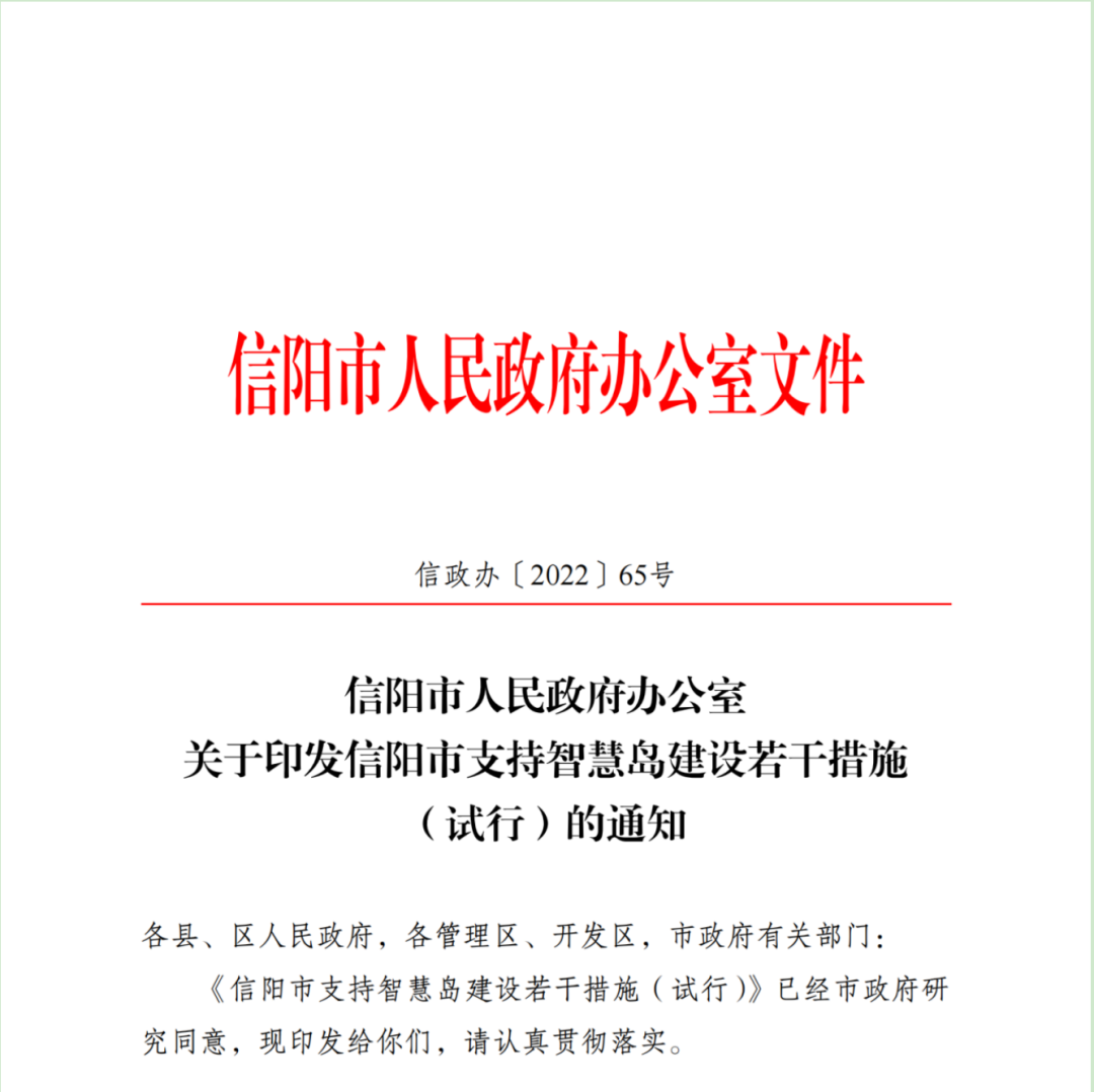 信阳市人民政府印发了《信阳市支持智慧岛建设若干措施(试行)的通知》,从人才引进、产业培育、组建高能级创新联合体、创业孵化等方面制定十七项政策措施,鼓励大众创业,支持科技人才引进。