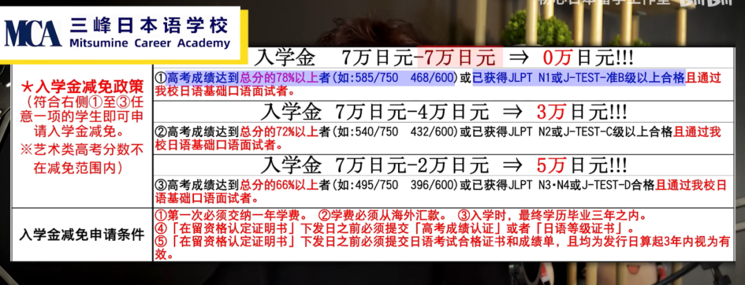 比如像三峰日本语,要是你日语达到N1或者高考成绩达到总分的78%以上可以拿到最高7w日元的减免。