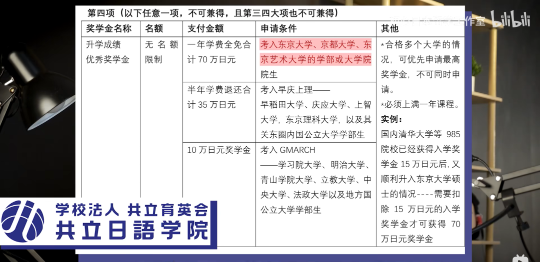 共立日语学院的奖学金更丰厚,毕业三年内的985毕业生和高考成绩达到80%以上的高中生可以直接拿到15w日元的减免。