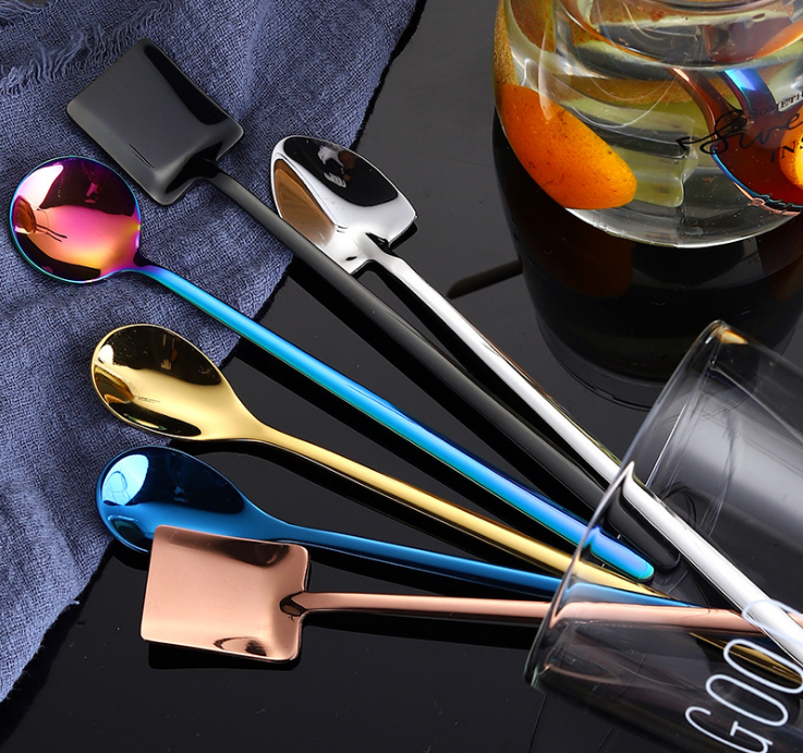 产品名称:新款创意304不锈钢勺子咖啡方头勺酒吧冰勺镀金长柄定制搅拌勺