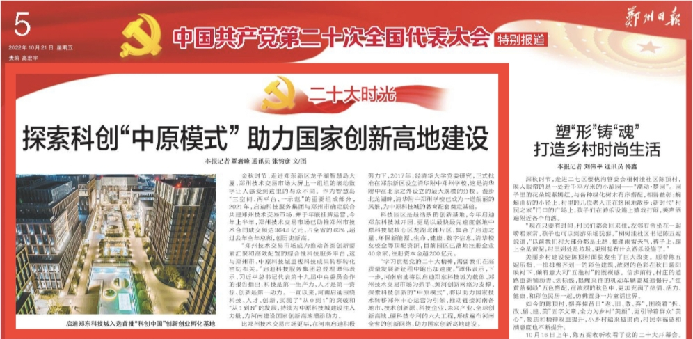 郑州日报“中国共产党第二十次全国代表大会特别报道”以《二十大时光 | 探索科创“中原模式” 助力国家创新高地建设》为题,介绍了河南启迪在豫多年耕耘的丰硕成绩。