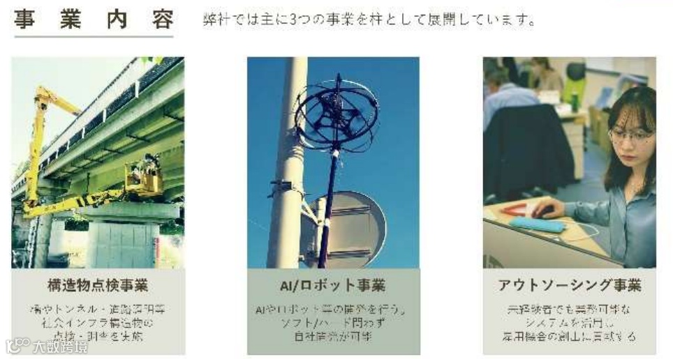 1. 本公司的主要业务包括基建设施建筑的检查业务、土木相关设备研发等人工智能和机器人业务和为就业弱势群体提供工作的外包业务。