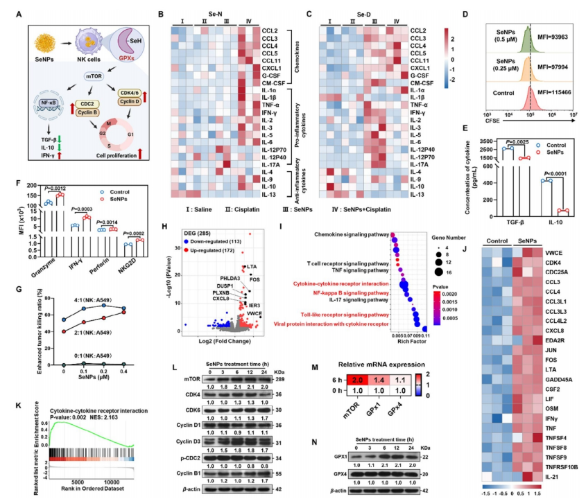 为深入探究LET-SeNPs激活NK细胞的具体机制,团队采用多组学联合分析方法,锁定硒蛋白GPX1为关键调控靶点,并首次发现mTOR信号通路在NK细胞活化中的枢纽作用。