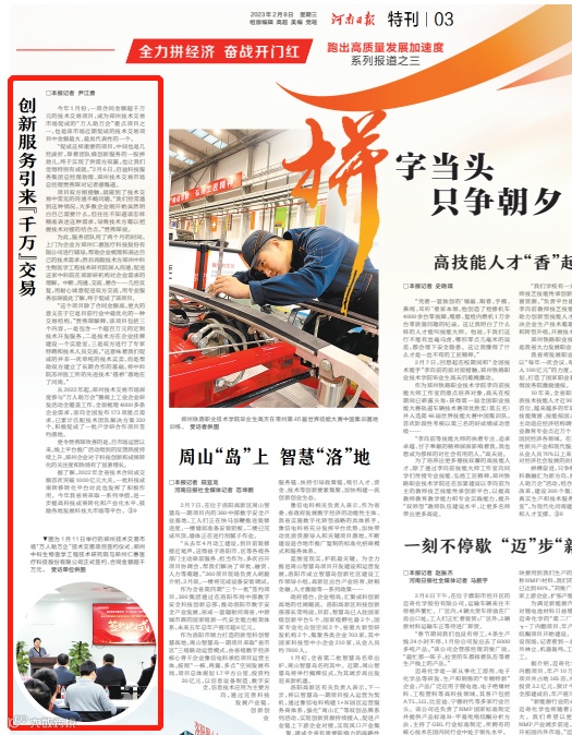 从2022年起,郑州技术交易市场深度参与“万人助万企”暨规上工业企业研发活动全覆盖工作,全面梳理4000多条企业需求,面向全国发布173项重点需求,已累计匹配技术团队解决方案320个,积极促成了一批产学研合作项目签约落地。