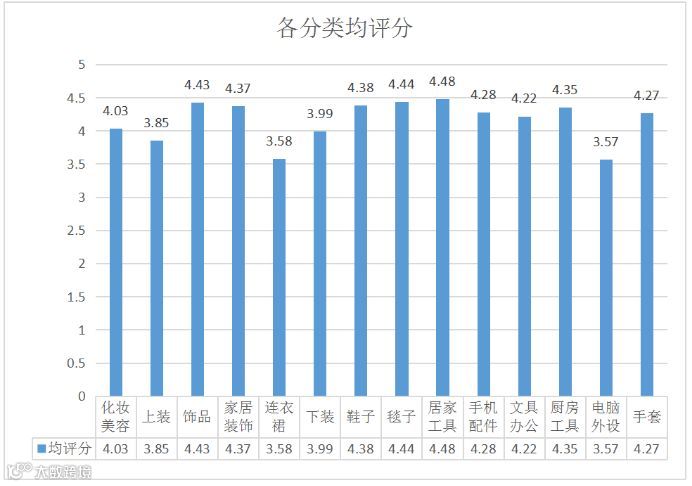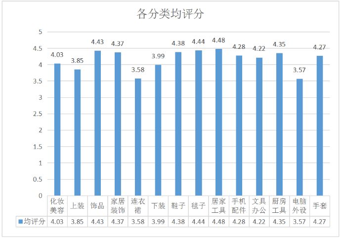 上装,连衣裙还有电脑外设这3个品类评分低于4分,其他评分都在4分以上,最高均评分是居家工具达到4.48分最低的为电脑外设只有3.57分。衣服类和电脑配件评分普遍低于4分属于正常情况。