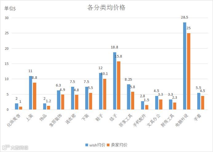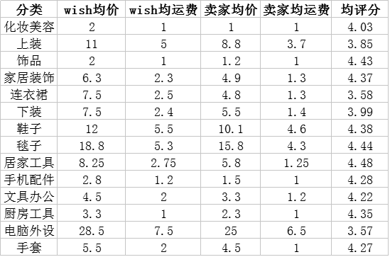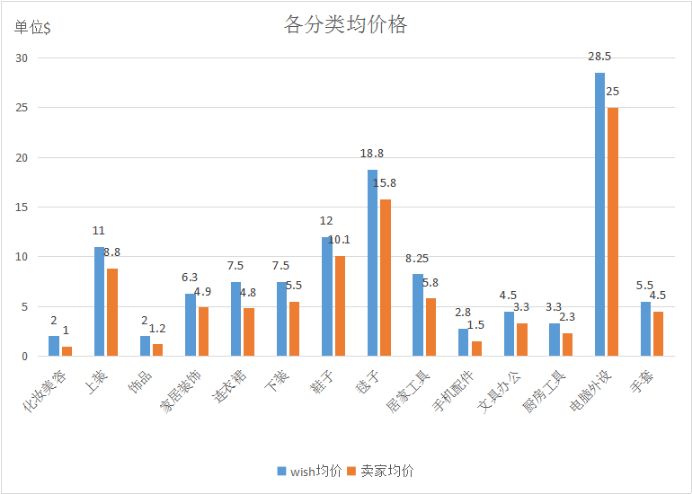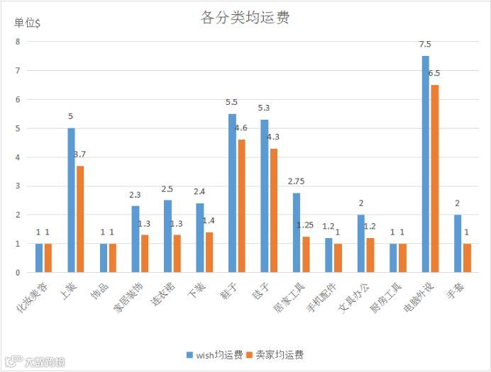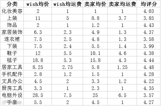 电脑外设产品价值本身比较高,售价达到25$左右,运费也是最高的达到7$左右。上装售价主要在9$左右,运费在4$左右。鞋子售价也达到11$左右由于鞋子普遍比较重,运费达到5$左右。