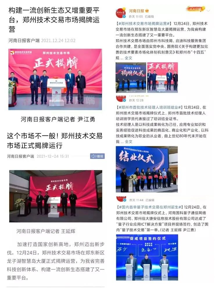▲ 河南日报客户端、河南日报微博接连发布多条新闻报道郑州技术交易市场揭牌