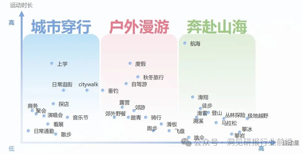 基于运动量与运动时长,运动户外可划分为三大场景:通勤、上学、city walk等轻量级城市穿行场景,飞盘、骑行、旅行等中量级户外漫游场景,徒步、登山、滑雪等重量级奔赴山海场景。场景的划分便于我们更好的解构运动户外羽绒服的差异化需求。