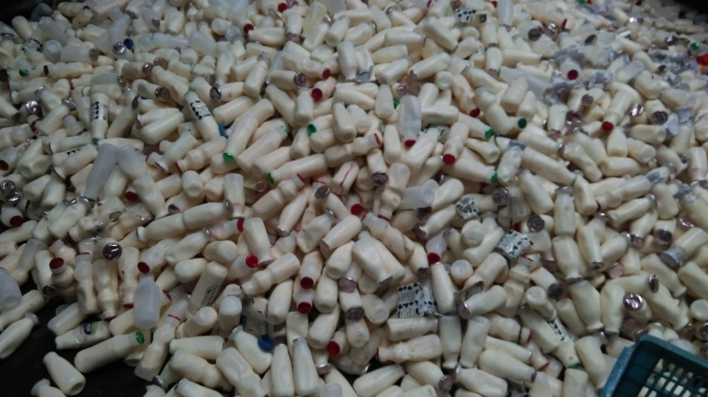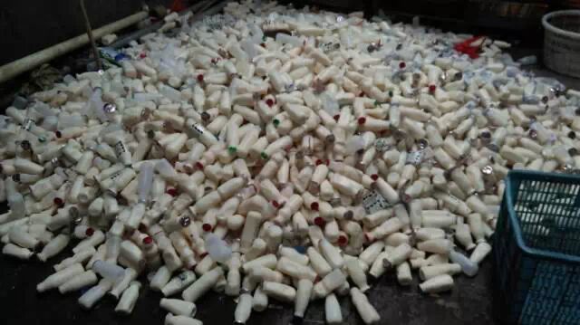 公司大股东徐某交代说,“我们回收来的这些早餐奶,都是由驾驶员每天送货带回来的,一般都堆放在生产车间后门口。第二天早上,厂里的包装女工过来上班,她们会用香蕉水擦拭掉原生产日期。因为擦掉后,瓶身上还会带有红印,所以要放入热水池清洗,用拖把洗,同时又可以将这些早餐奶加热。之后再放上流水线喷码打印新的生产日期,并混进当天生产的热奶里。当天处理好的这些回收早餐奶都会在当天再销售出去。 ”