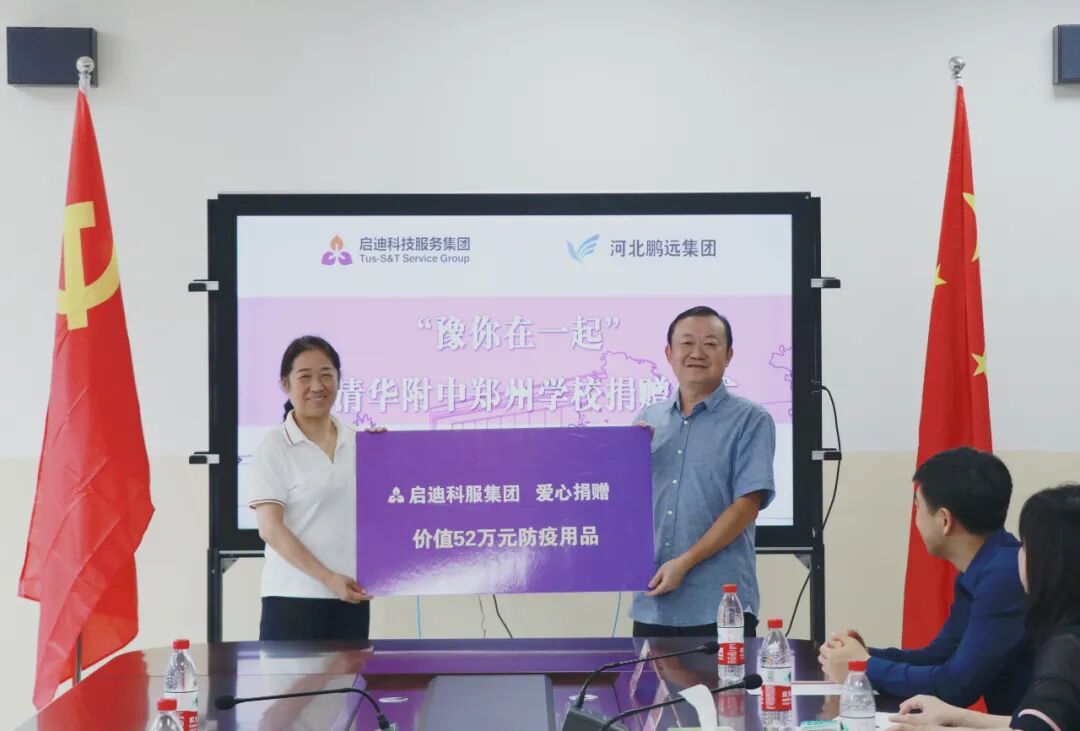 河北鹏远集团董事长朱立秋作为清华大学校友,被郑州的疫情牵动,从河北秦皇岛将自己企业生产的10万只KN95口罩送到郑州,助力学校疫情防控常态化工作,为广大师生的平安健康保驾护航。“水灾和疫情都难以阻挡我们对河南启迪和清华附中郑州学校的牵挂,为促进校企携手共克时艰,就有了今天的捐赠。”朱立秋说。