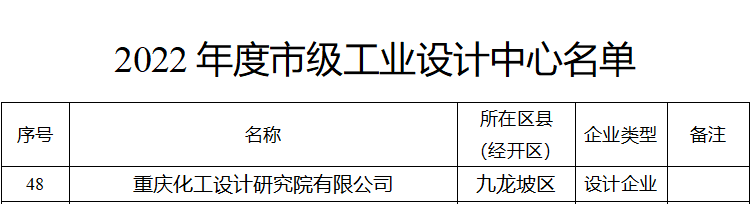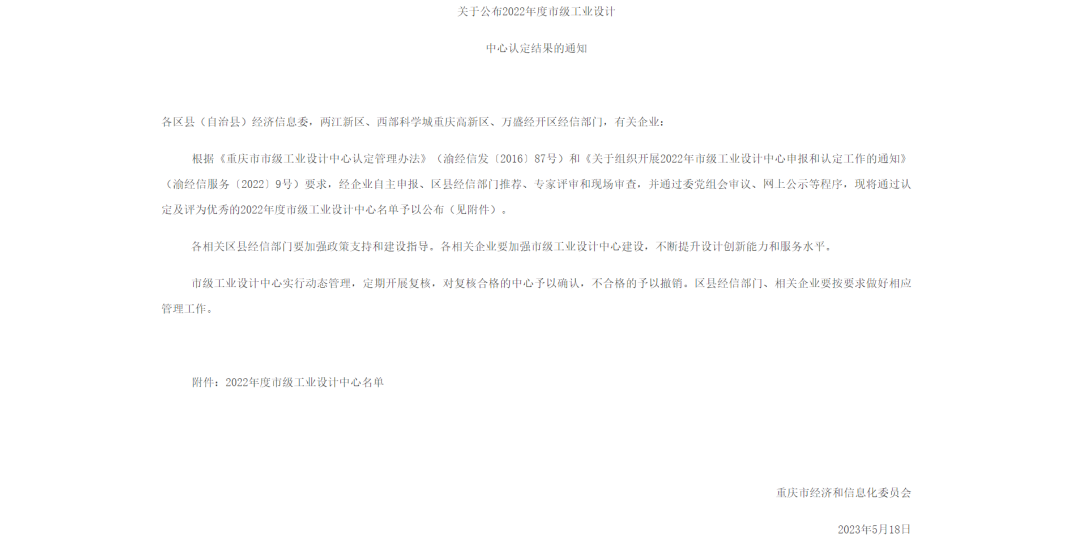 根据重庆市经信委《关于公布2022年度市级工业设计中心认定结果的通知》的公布,重庆启迪科技园入园企业