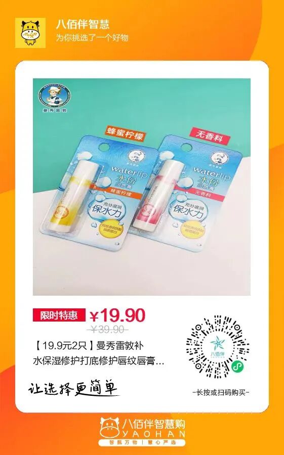 导读:热卖沐浴露爆品👇明星热卖身体乳👇点击图片,长按识别二维码即刻购买秋冬必备唇膏曼秀雷敦补水保湿润唇膏 19.9