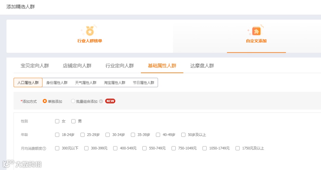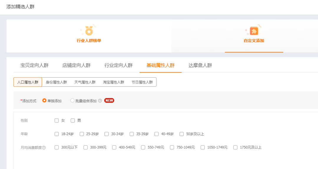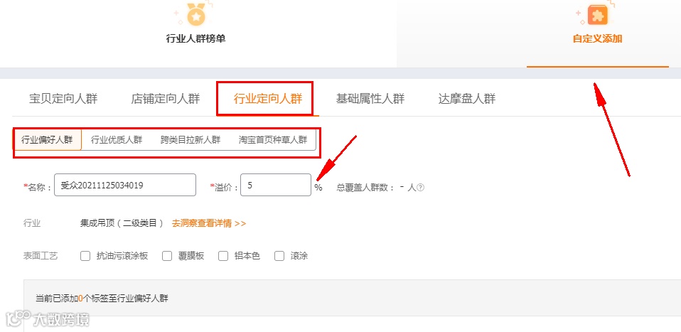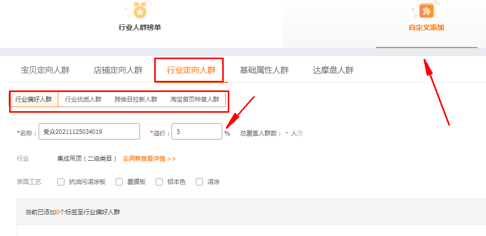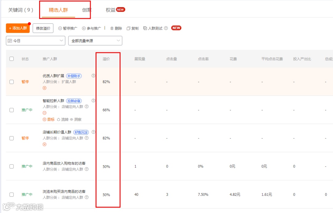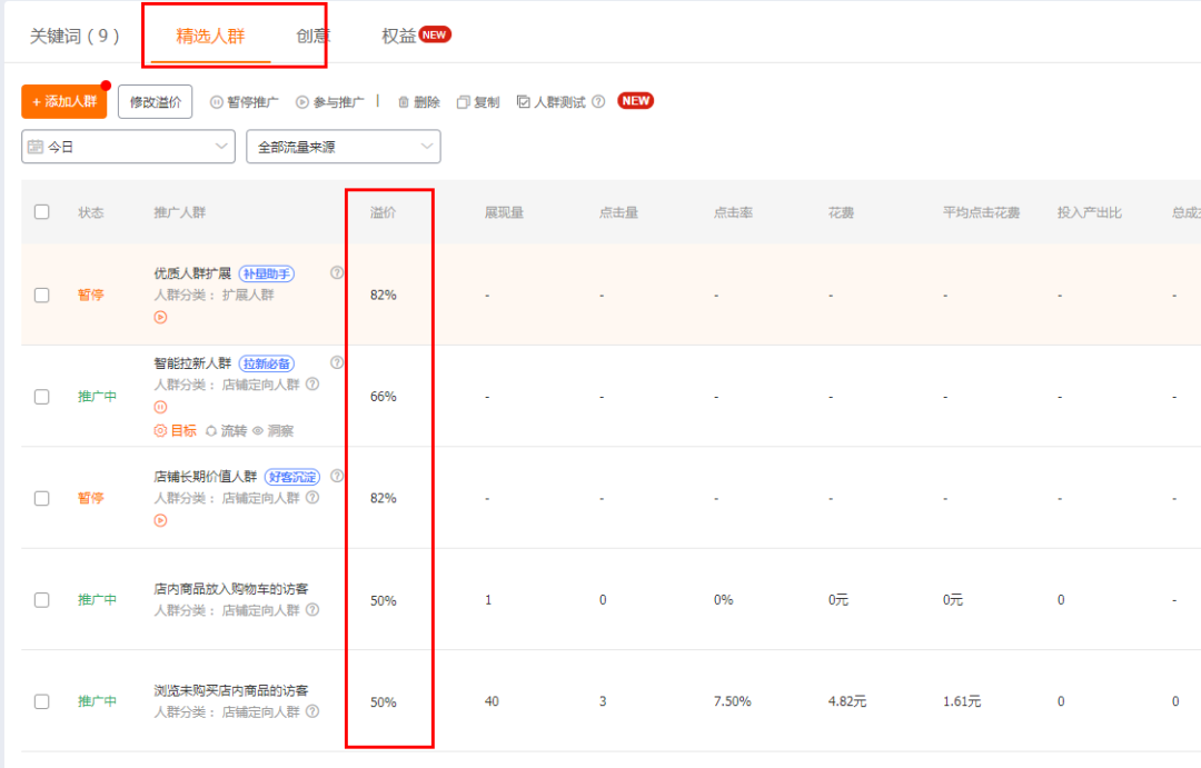 接下来就是我们的重点了,因为我们前期想要提高点击、收藏加购的核心是精准人群,所以这个时候,我们就要采用词低出价,人群高溢价的形式,来精准匹配到我们的人群。