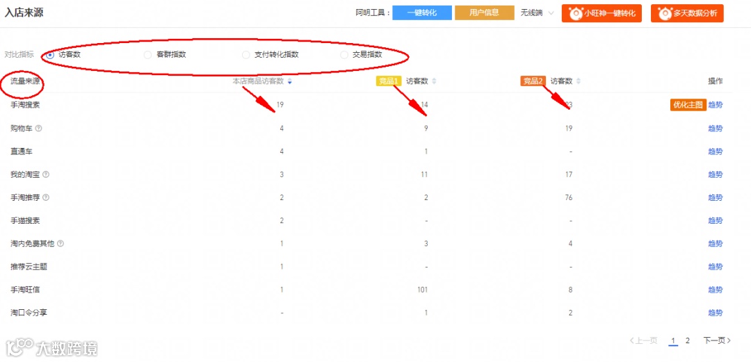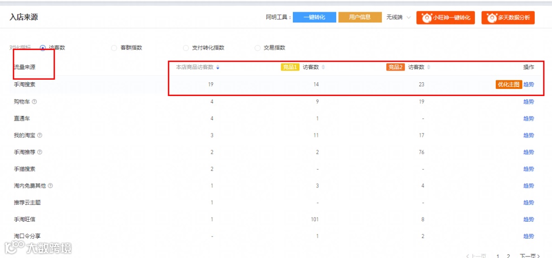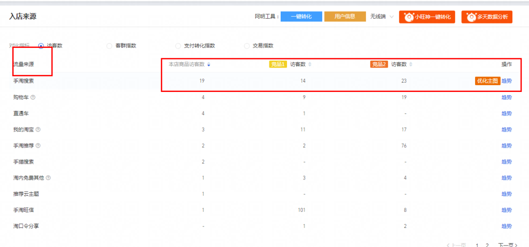 除了词的区别之外,我们也可以通过进店流量的来源,得出该类目中流量的主要来源,如果流量来源主要是搜索、推荐、直通车等等这几种常规渠道,那么我们就可以作为竞品,因为这些渠道都是有操作空间的。