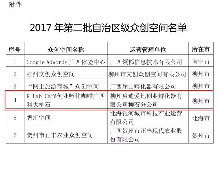 近日,广西科技厅根据《广西壮族自治区众创空间备案认定办法》的有关要求,组织了2017年第二批自治区级众创空间备案工作,经组织专家审核,广西科大(柳石校区)启迪K栈、K-LabCafé双创孵化基地(K-Lab Café创业咖啡广西科大柳石)正式被评定为自治区级众创空间!