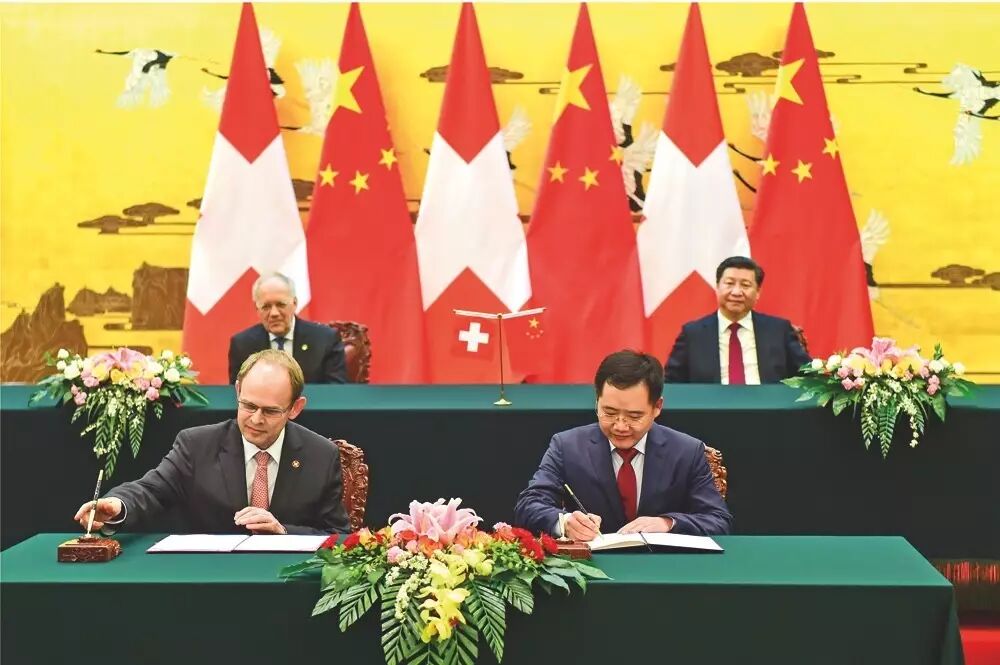2016年4月,中国国家主席习近平与瑞士国家主席施耐德·阿曼共同见证启迪控股董事长王济武(前排右)与瑞士国家创新园签署合作协议