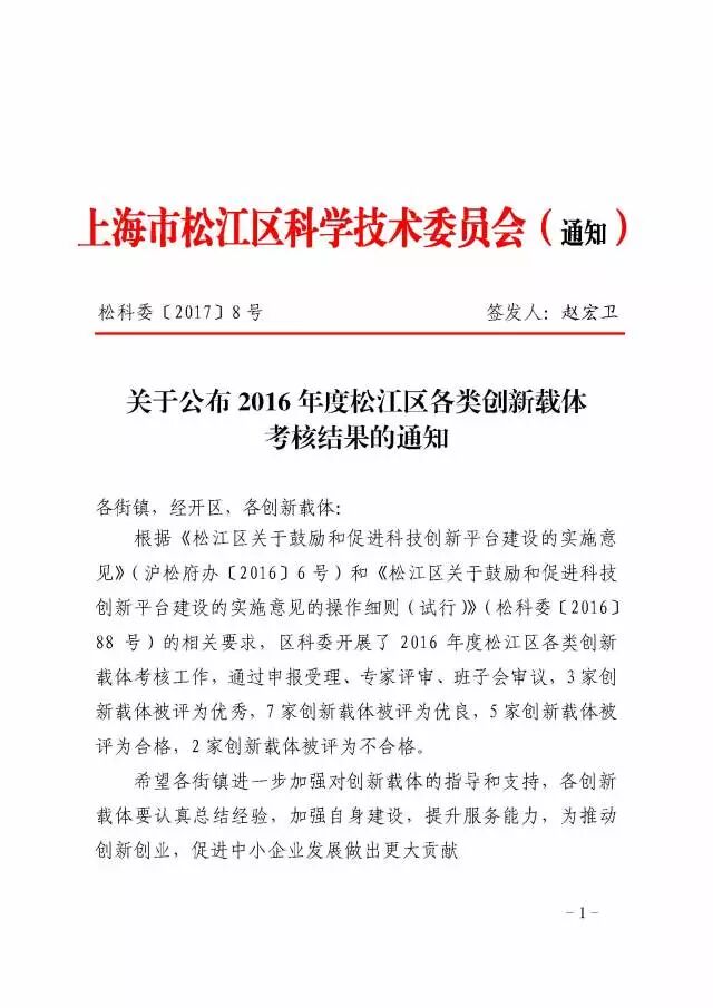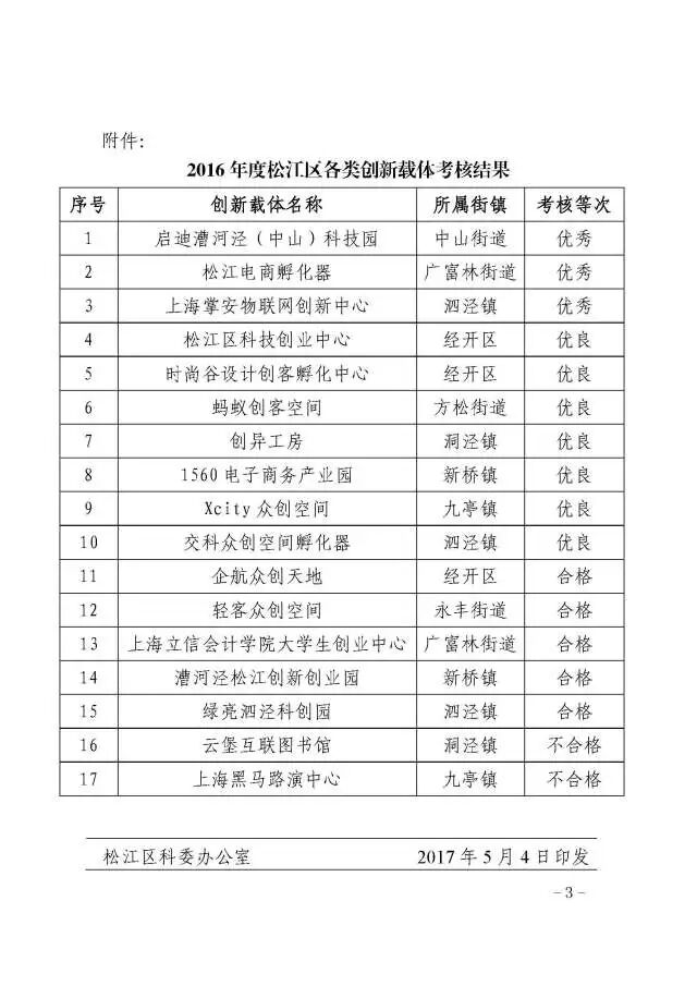 关于公布2016年度松江区各类创新载体考核结果的通知