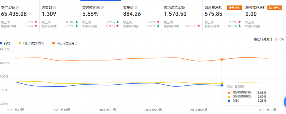 我们在生意参谋中可以看转化率数据的时候,系统除了我们店铺本身的数据外,还会给到我们同行同层平均、以及同行同层优秀的数据。