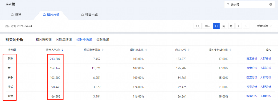 属性词与核心词不同,属性词主要去找搜索人气高但在线商品少的词。之后在组成一个标题后,再通过数据反馈进行二次校正。这一步至关重要,没有人能一次性优化出一个完美标题,最终结果还是要以实际数据为准。