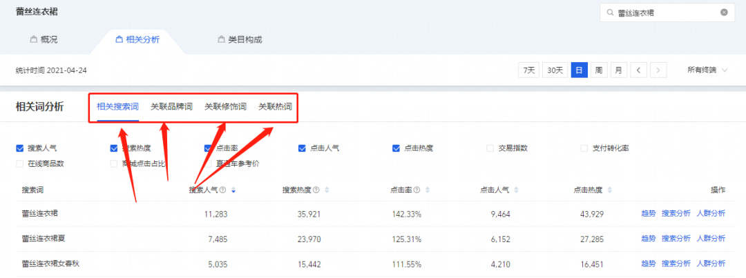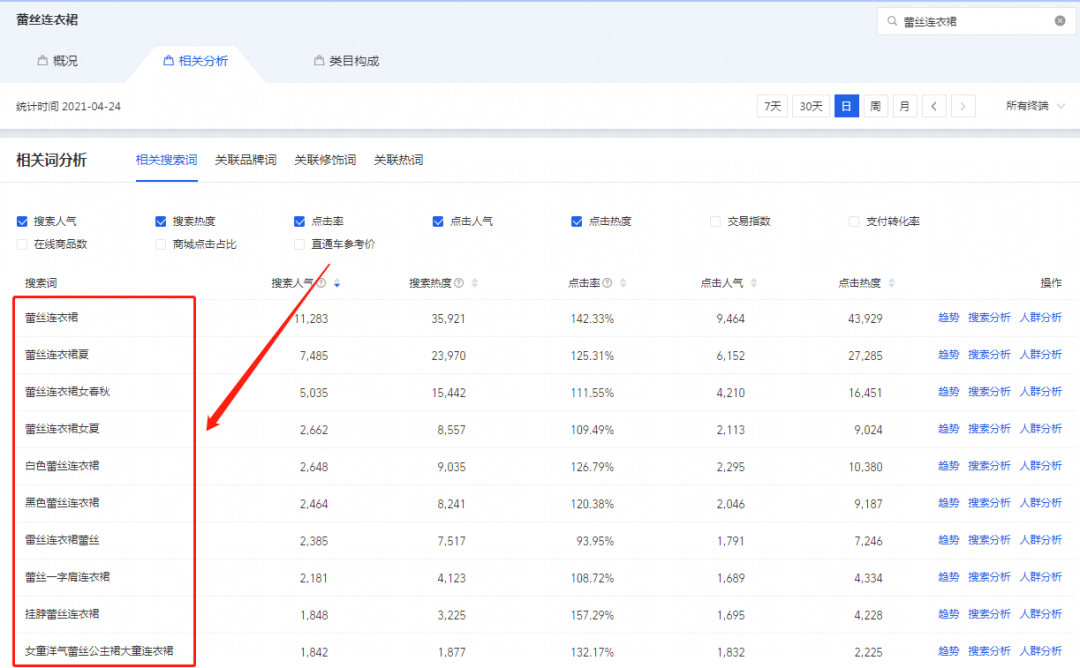 比如我们通过“连衣裙”这个词根,进一步扩展成”蕾丝连衣裙”,这个关键词搜索量还是大,那就继续用这个词进行搜索扩展。