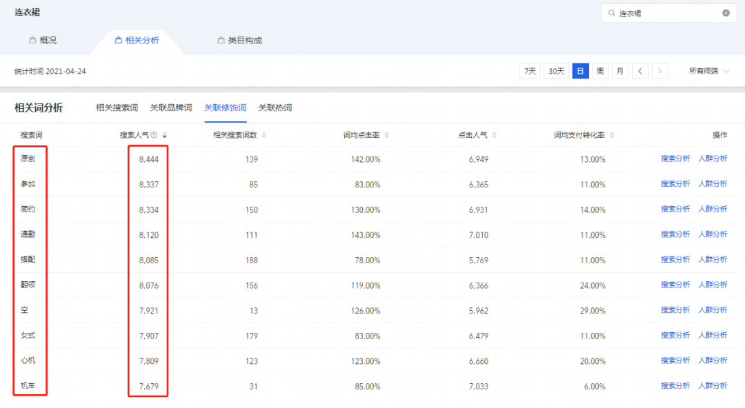 到核心词相关修饰词与长尾词的热度,关键词我们从这里去挑选就可以了。