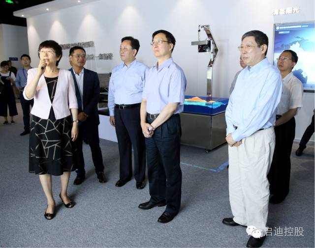 启迪控股董事长王济武(前排左一)向中央政治局委员、上海市委书记韩正(前排左二),上海市委副书记、市长杨雄(前排右一)等领导介绍启迪控股在上海的战略规划