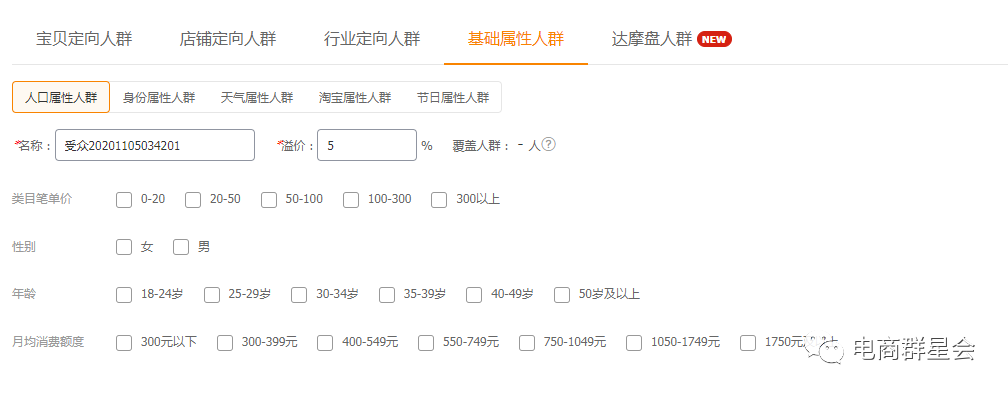人群在我们通过基础人群数据测试出来后,通过拉升精准人群的溢价来拉正店铺整体人群标签。在标签正常后,我们就可以