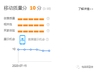虽然在我们商家端可以看到的分数最高就是10分,但实际上,在阿里的系统后台,我们的分值是还能够继续上升的,所以这也是我们有时候会看到,10分后我们的ppc还在继续下降的原因。