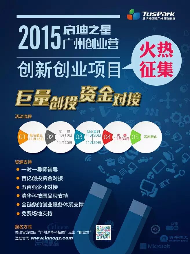 为促进创新创业项目落地孵化,启迪科技园广州创新基地举办“启迪之星·2015广州创业营”,旨在通过产业龙头企业的资源支撑,选拔有潜质的项目,提供一对一导师辅导、百亿风投对接、五百强企业对接、清华科技园品牌支持、全链条的创业服务体系支撑、免费场地入驻等孵化服务。