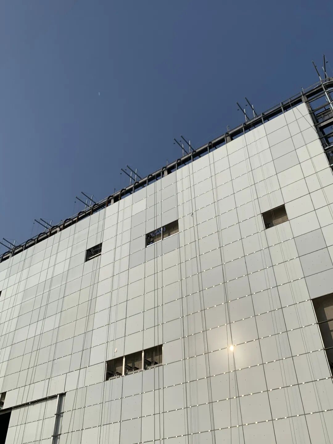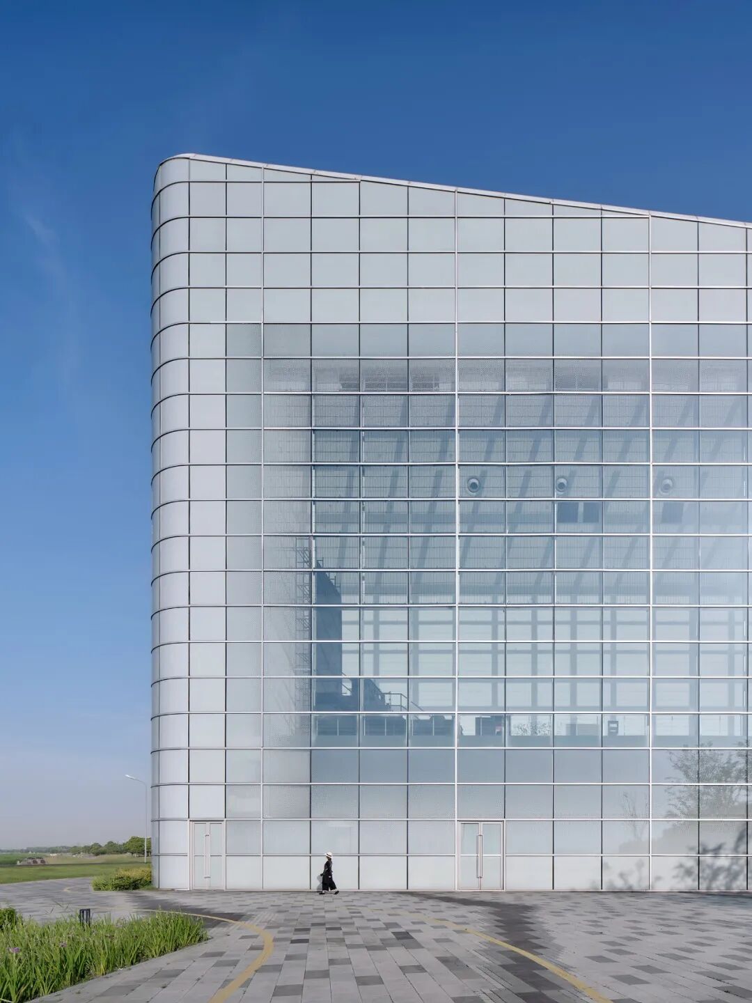 经过与施工方和玻璃厂家商议后,设计师将上墙后的釉面玻璃深浅编号(白釉玻璃只有上墙后才能看出色差),将颜色略深的玻璃拆下,安装于较低处,将较白的玻璃安装于较高处,让墙面颜色呈现微弱的渐变效果。在外部光照状态下,建筑表面颜色本身也会出现自然的深浅光晕渐变,因此,顺应这种状态,玻璃的重新排版,让设计师在无奈接受玻璃生产中无法回避的色差问题的同时,有效地控制住了外观呈现结果。