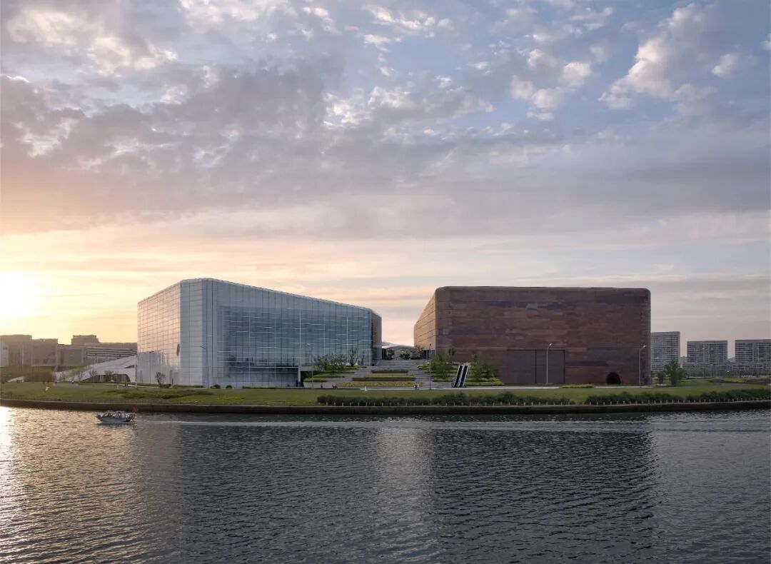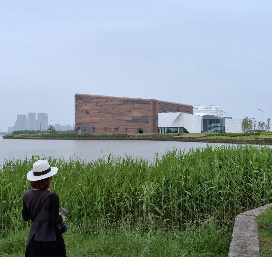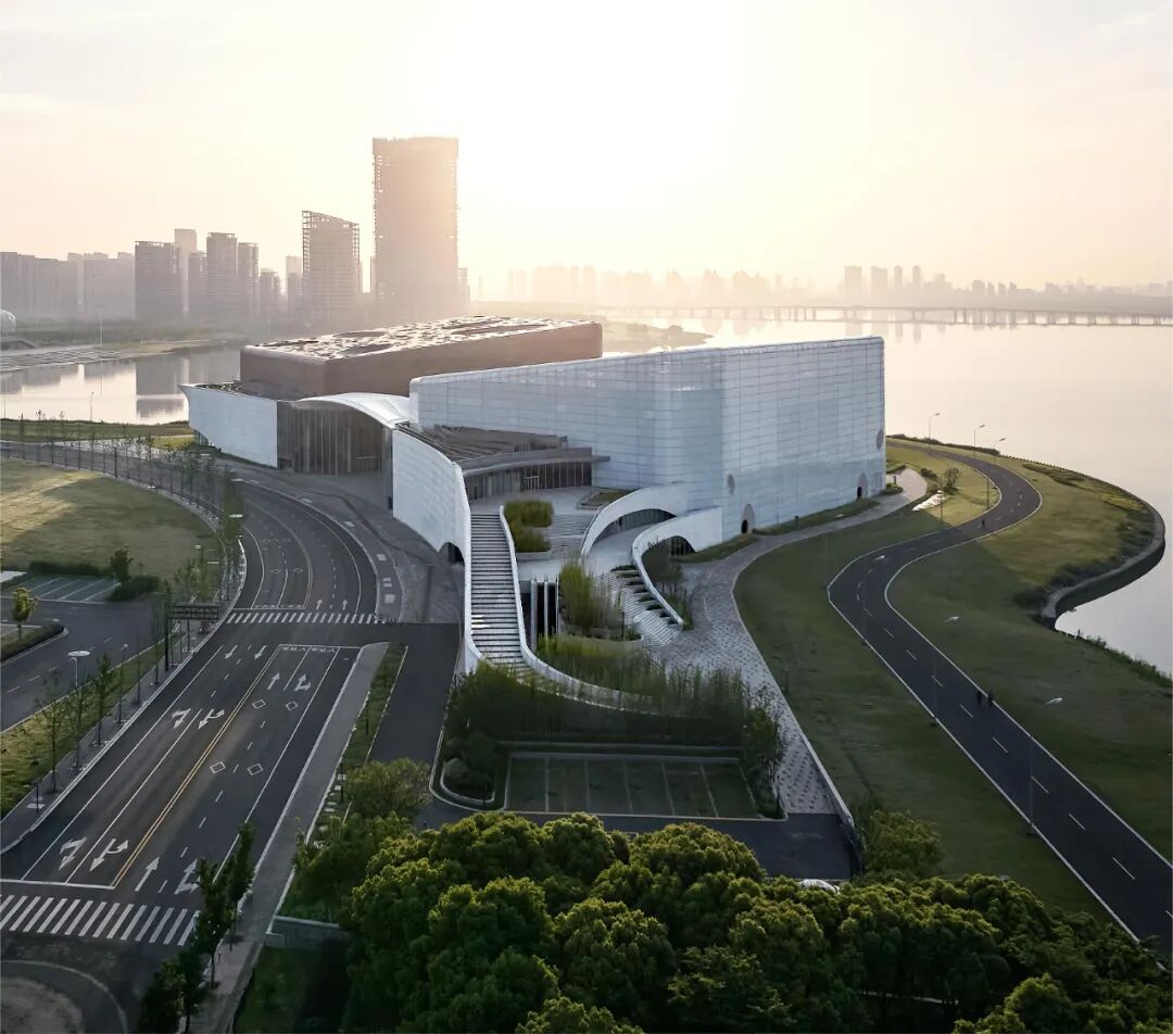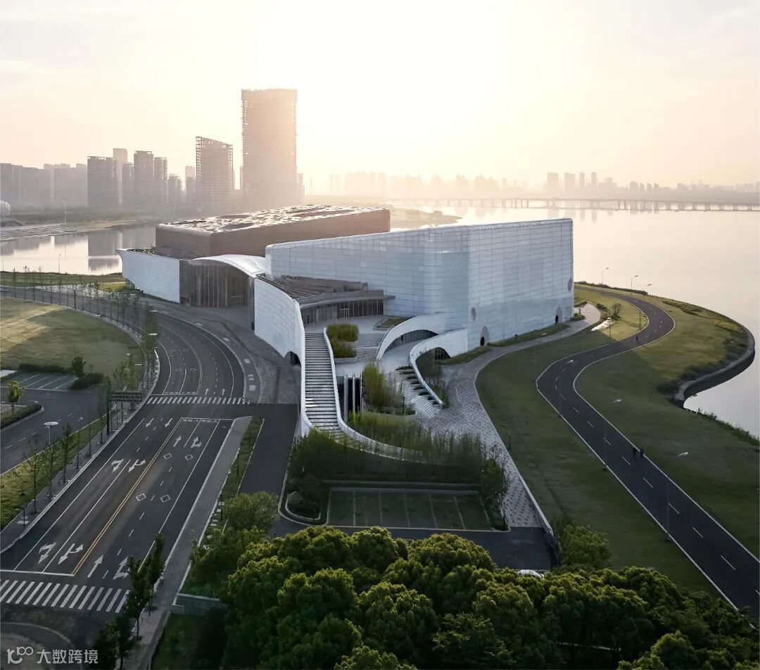 两个观演厅外观在色彩和质感上迥然不同,又都极为纯净。设计试图通过这种简洁明了又大开大合的方式,让建筑与开阔旷达的太湖环境匹配,在城市的大尺度上审视,能呈现出相似于“大漠孤烟直,长河落日圆”的自然大美。