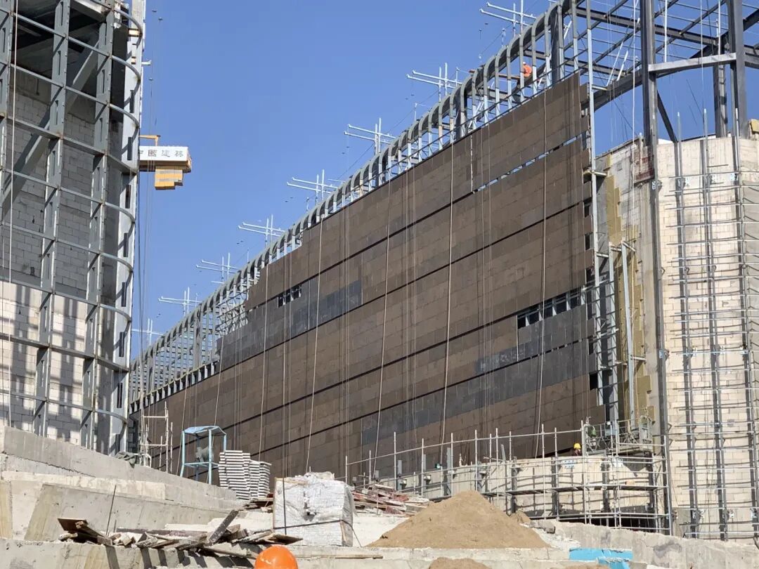 南侧观演厅表面采用白色釉面钢化夹胶玻璃作为饰面材料,每块玻璃尺寸为1800X1500mm,采用“横明竖隐”的方式安装在银白色幕墙龙骨上。由于玻璃厂家无法做到不同批次产品的釉面纯度完全一致,而白色的色差容错率又极低,在玻璃上墙的初期,曾出现了白色墙面上深深浅浅的失控状态。与石材不同,白色玻璃墙面上的不规则色差并没有带来自然的质感,而是杂乱感。