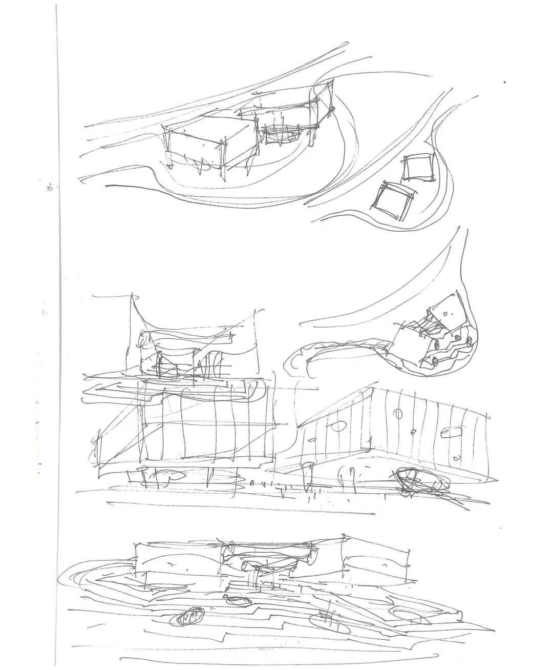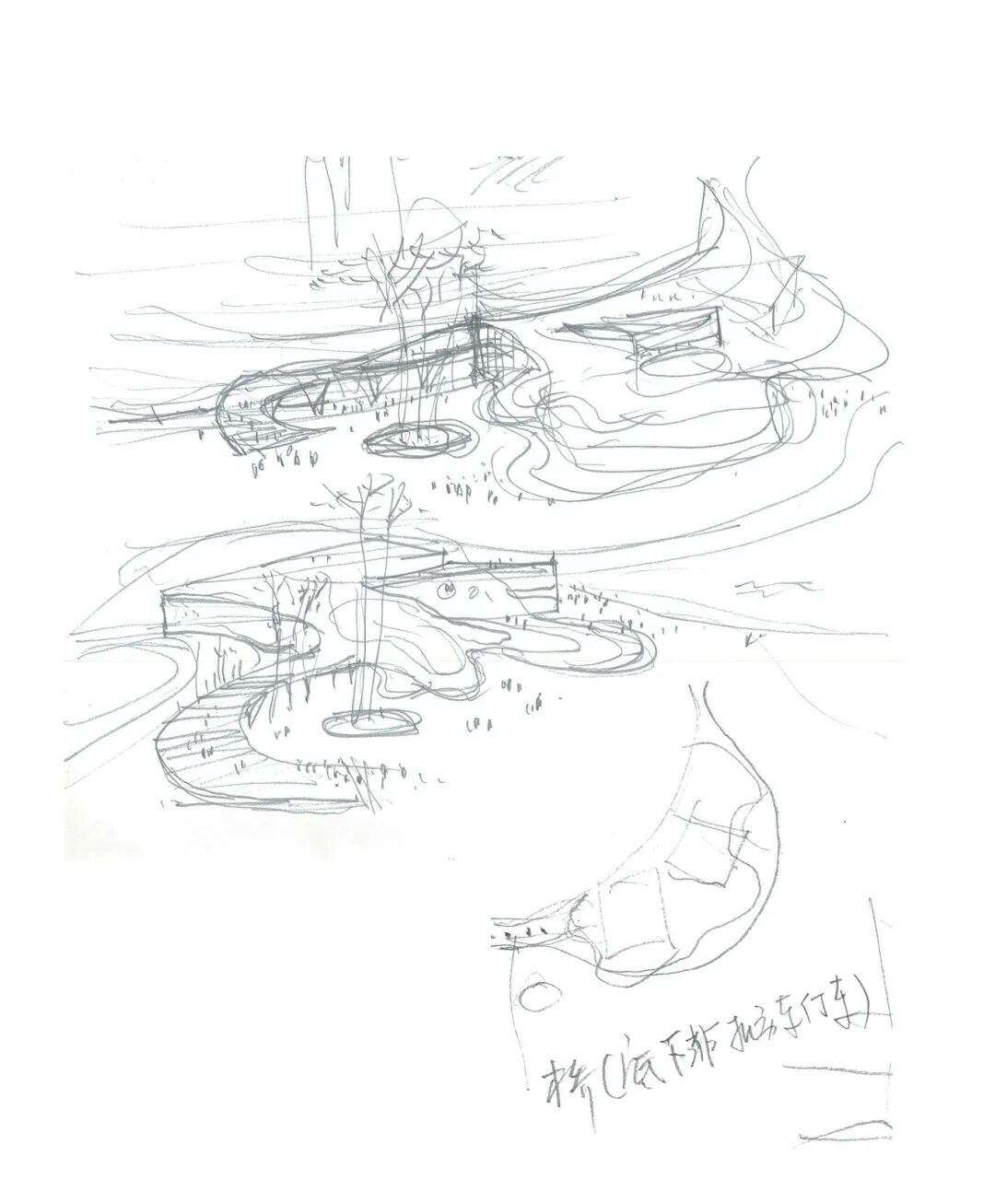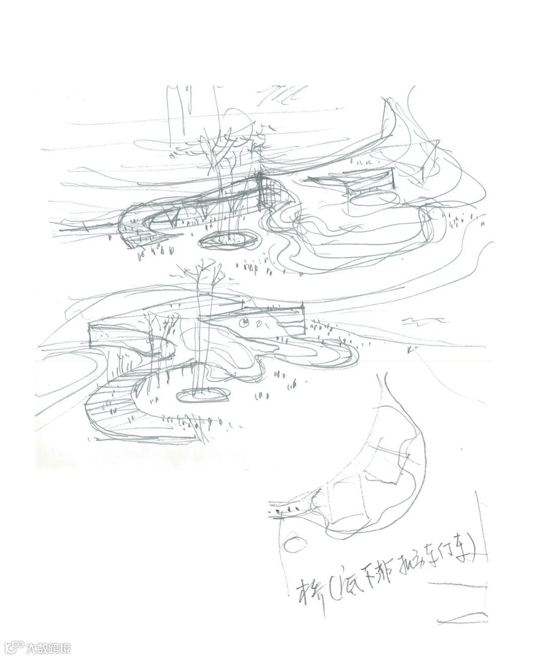 两个观演厅及其附属功能的体量很大,对城市空间和自然空间形成了阻隔。庄院士在草图中表达了建筑要留有城市空间向自然空间贯通开放的可能性。