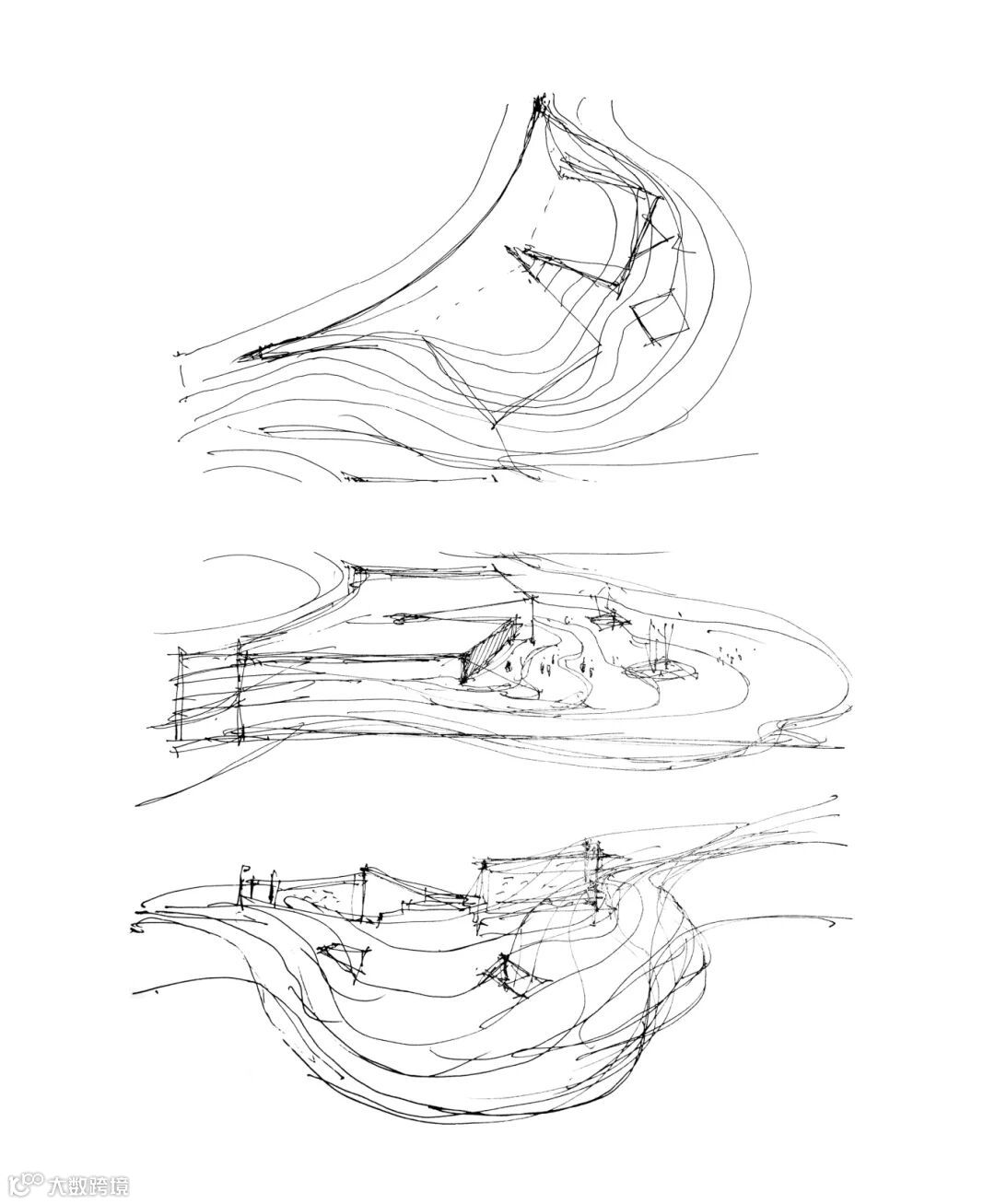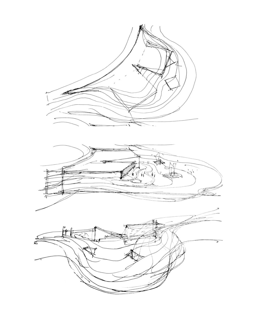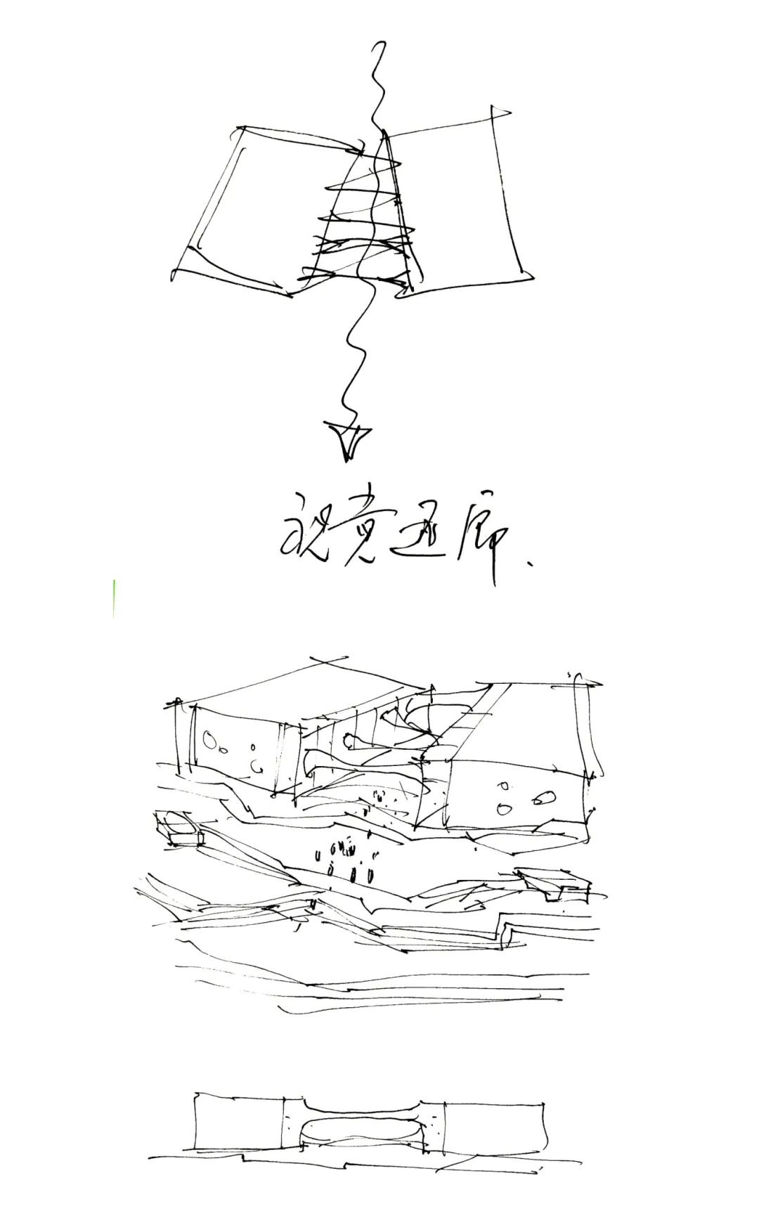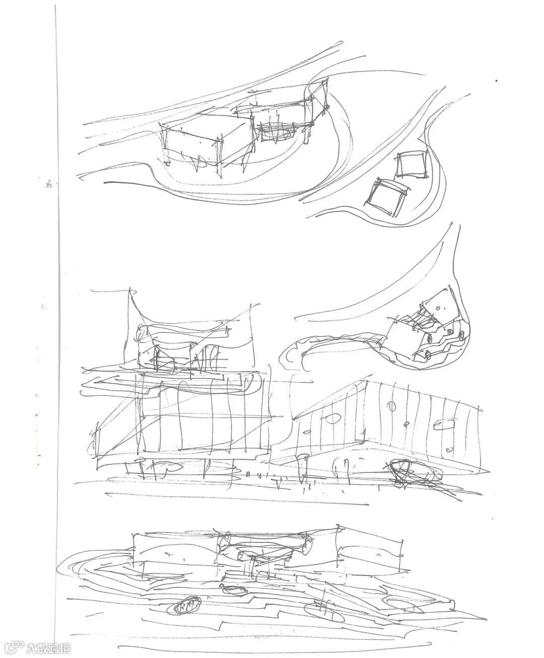 两个观演厅及其附属功能的体量很大,对城市空间和自然空间形成了阻隔。庄院士在草图中表达了建筑要留有城市空间向自然空间贯通开放的可能性。