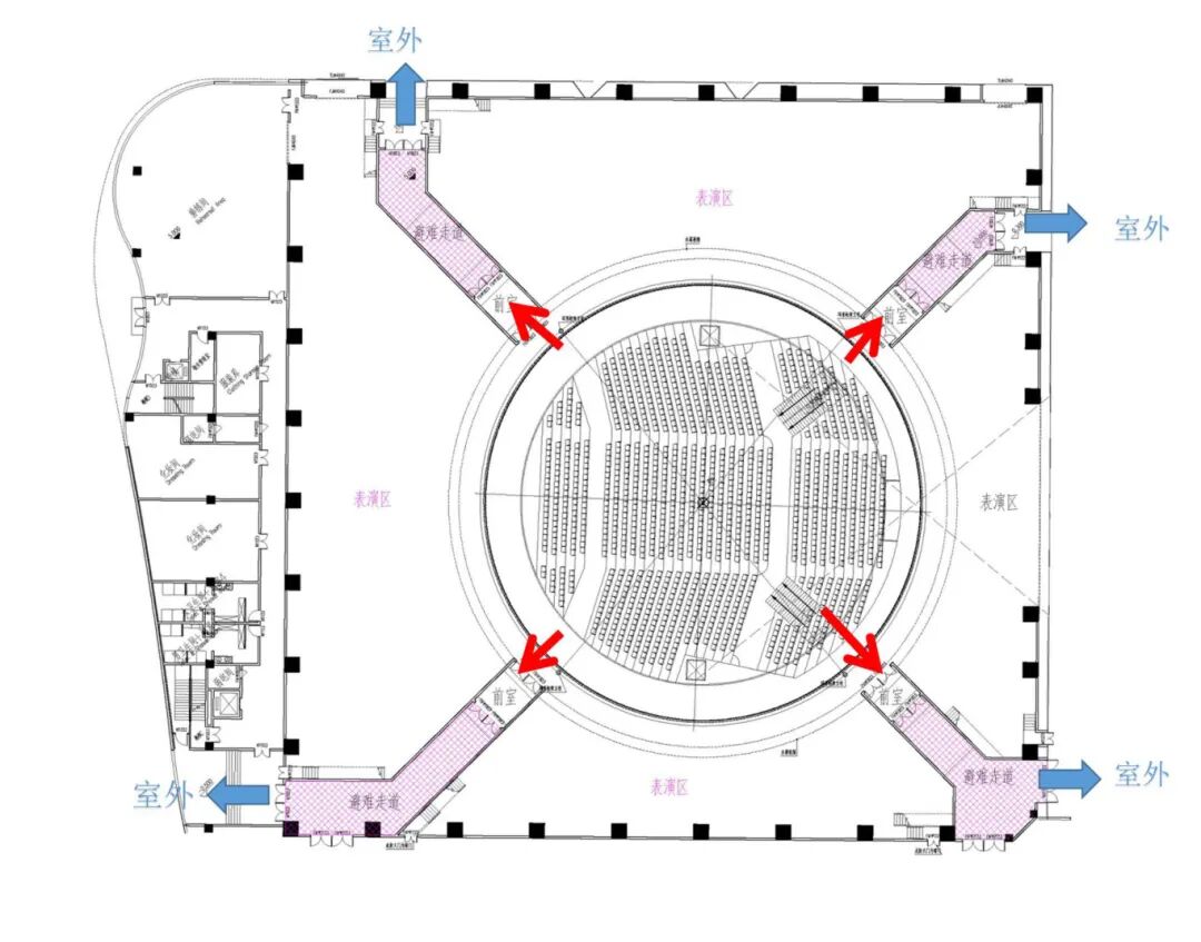 每个观演厅的观众席位于厅的中央,是一个直径43米的圆形区域,坐席采用阶梯式,可360度旋转。方形的观演厅扣除中央的观众席,四周就都是舞台区,共四个。观众席通过自身旋转,让观看过程在四个舞台的连续表演中无缝衔接、切换。四个舞台区之间由四条安全疏散通道分隔,疏散通道从观演厅的四角“钻”向中央观众席,一端连接观众席,另一端直通室外。设计将四条疏散走道定义为“前室+避难走道”性质,设置机械加压送风系统,内部不设置可燃物,墙体采用防火隔墙,除乙级防火门外,不设置与疏散无关的其他门窗洞口。这四条避难走道长度为10.7~22米。舞台区的疏散与观众席相对独立,设置疏散门直通室外。在少量无法直通室外的部分,设置前室通向避难走道。