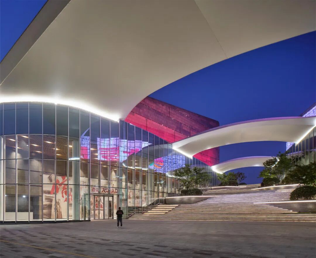 为了激活区域的全时段活力,特别是入夜后的活力,设计师给剧场做了多套模式的泛光照明设计。在夜间不同时段,不同节假日期,剧场都能呈现出不同的色彩和状态。白釉玻璃与土建结构之间的空腔内,满布了成像光栅,这使得这个观演厅成为了一个立方屏幕体。入夜后,大屏幕可以播放正在演出的戏剧片段,也可以配合不同时期剧场相应的主题,播放音乐节、环太湖赛事、假日露营等主题的宣传影片,吸引湖边游人驻足或专程赶来观看。剧场在夜间的表现,让太湖沿岸的城市活力在这个节点达到一个高潮,也让日间的“太湖魅力”和“演艺营城”运营成效,在入夜后达到一个色彩斑斓的高峰。