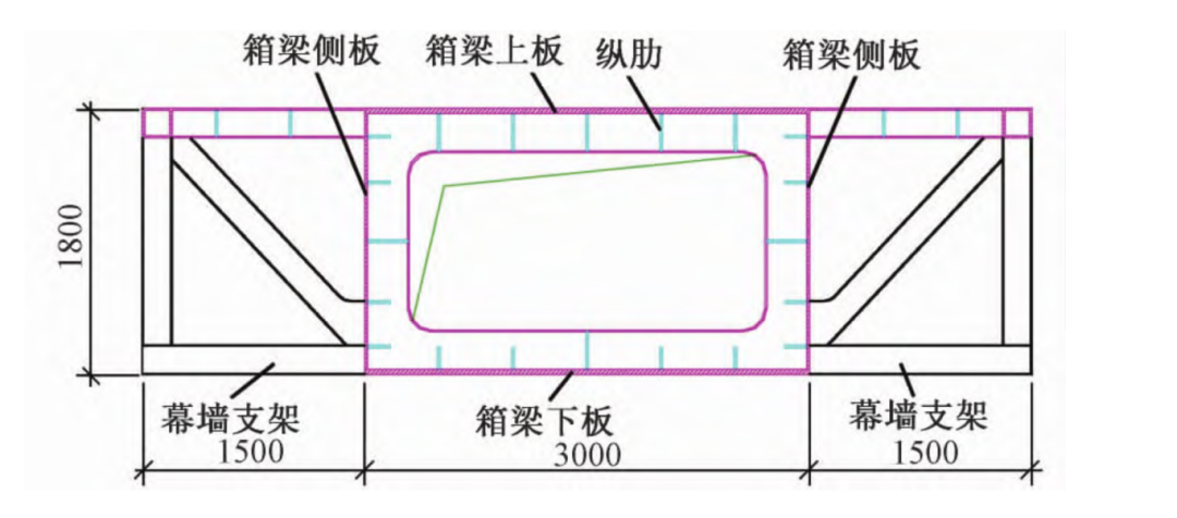 在剧场的结构设计中,跨度60余米的人行连桥具有较大的挑战性。这座连桥宽度6m,桥面总长度约64m,两端各采用两根钢管混凝土柱组成桥墩支承,柱体隐藏在两端的建筑之中。低端桥墩顶标高1.28m,采用固定铰支座,高端桥墩顶标高6.54m,采用单向(顺桥向)活动铰支座,这样可有效减小钢管柱的应力,优化桥墩截面,减轻结构自重。两端桥墩之间不再设置其他桥墩,以保证桥下的通畅性,便于城市和自然界面之间人流和视线的贯通。根据跨度,连桥结构主体采用断面3m宽、1.8m高的钢箱梁,两侧每隔2m设置1.5m宽钢桁架与钢箱梁侧板相连。钢箱梁沿连桥长度方向采用变板厚,每隔2m设置横向加劲肋,横向加劲肋之间沿箱梁四周设置纵向加劲肋,上下支座位置按受力要求加密加厚处理。桥面浇注100mm厚的C30混凝土面层,内配业8@ 150双层双向钢筋。[1]