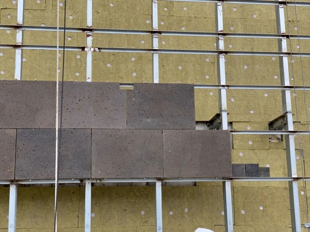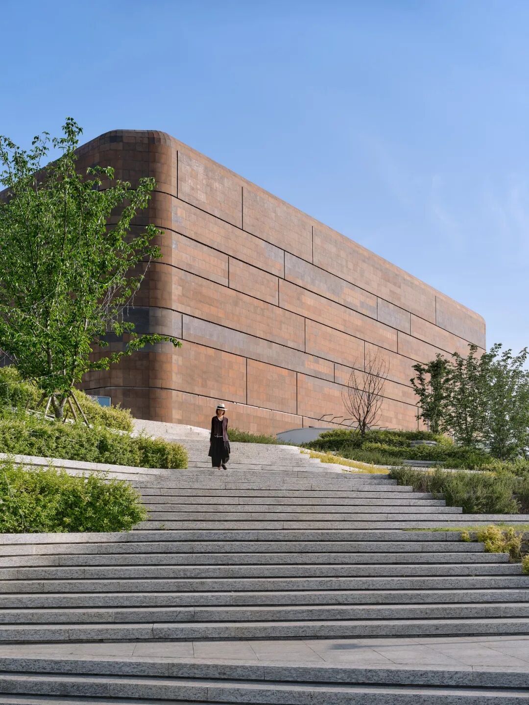 北侧观演厅表面采用棕红色火山岩石材作为饰面材料。建筑体量很大,外表面也没有开窗,为了表达自然的尺度,与水天一体,设计采用1010X700mm、30mm厚的大块面石材,并在石材的拼色上做了两个层次的设计,使其更具质朴自然的质感。第一层次,设计师选择了三种深浅颜色的火山岩石材,通过立面色块的设计,把建筑立面机理确定下来;第二层次,设计师在石材三种深浅颜色大调子的基础之上,给每个颜色确定一个色差的范围,让同色部分也有着自然斑驳的质感,这实际上也是给施工一个容错的范围,让设计更加贴合施工的现实情况。