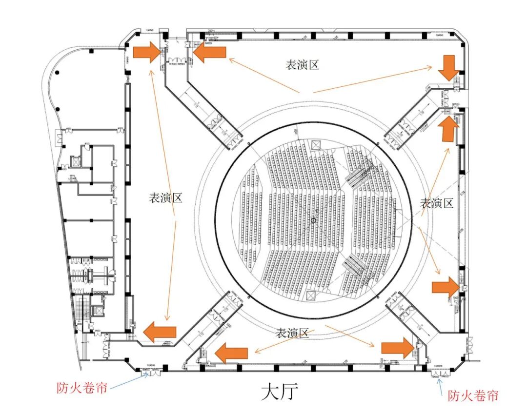 由于360剧场的观演模式在国内首次出现,建筑平面尺寸受制于国外观演设施,这给观演厅的消防设计带来了挑战。