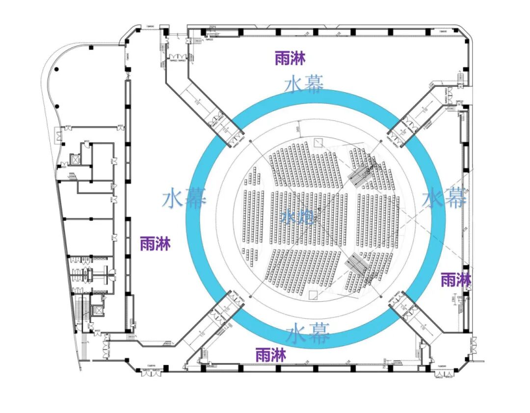 由于观众席可容纳1350人,剧场建筑的规模定性为大型剧场,应在舞台台口设置防火隔离幕。由于项目观演模式的特殊性,可旋转的观众席四周全是舞台,没有明确的台口空间,或者说圆形观众席区域的边界全是台口,目前没有能满足这种消防要求的弧形防火隔离幕设备。面对这种特殊性,设计师采用了防火水幕(《剧场建筑设计规范》(JGJ57-2000 J67-2001)8.1.1:大型、特大型剧场舞台台口应设防火幕。条文解释:当未设置防火幕时,也可设防火水幕带作为防火间隔,但应保证充足的消防水源[2])。设计在观众席四周设置了一圈环形水幕设施,持续喷水时间不小于1小时(按照《舞台机械刚性防火隔离幕》(GB36726-2018)第4.4.1.1:幕体的耐火极限时间不应小于1个小时,因此水幕的持续喷水时间不小于1个小时[3])。喷水区避开四个避难走道对接观众席的疏散口,保证人员疏散的通畅性。