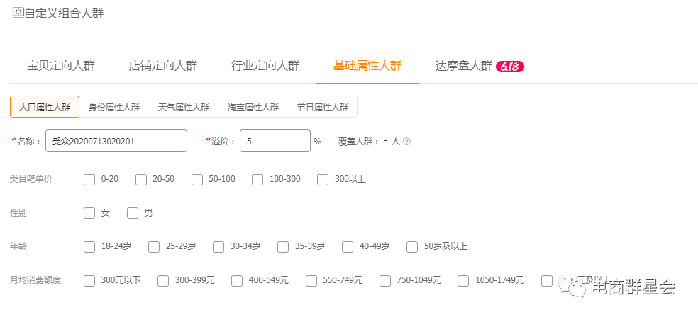 基础属性人群分为“人口属性、身份属性、天气属性、淘宝属性以及节日属性”五大类,是新老司机开车必备人群,尤其是你的人群标签乱了的情况下,开基础属性去拉正人群标签就是比较好的选择。