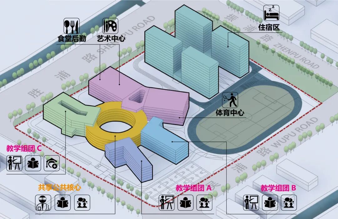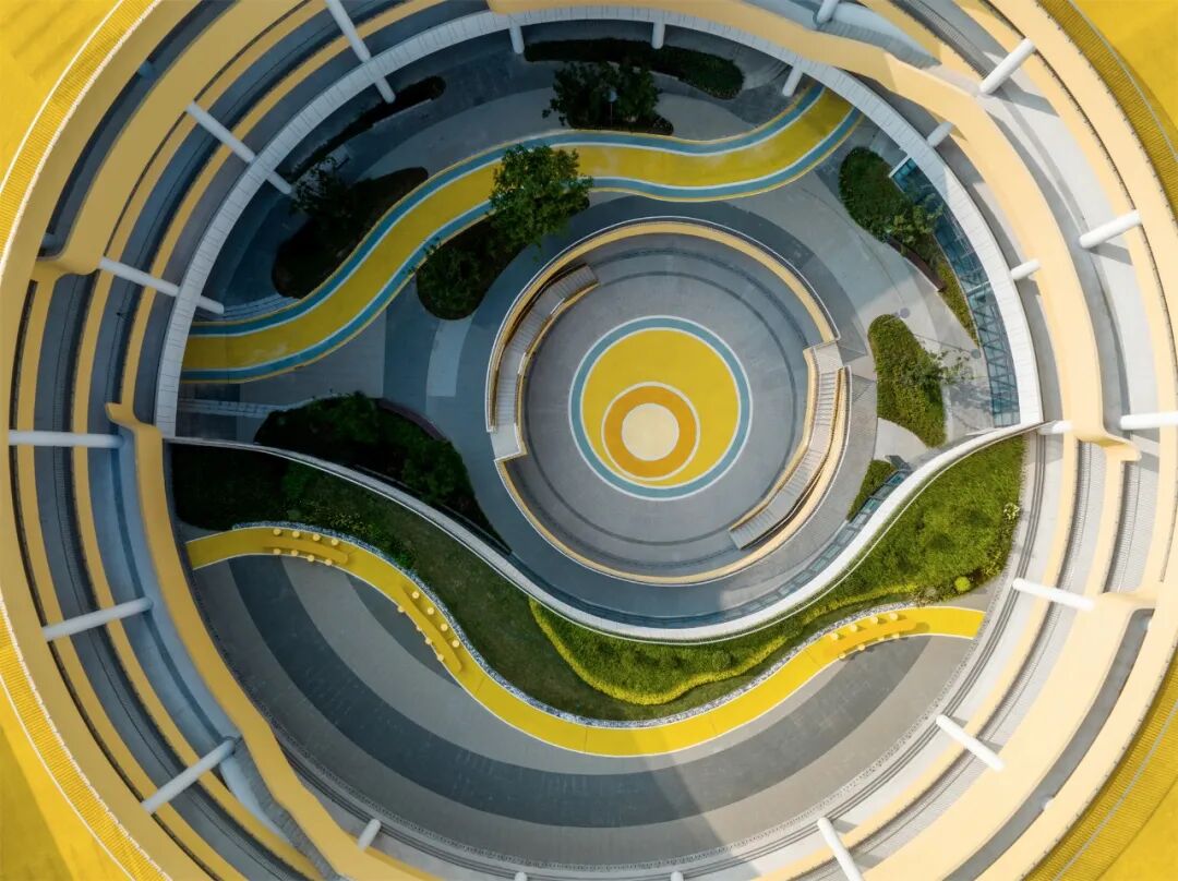 校园设计突破传统校园核心式、线性式或树状分叉式的空间组织模式,采用大尺度环形结构作为校园骨架。这一设计实现了三大空间革新: