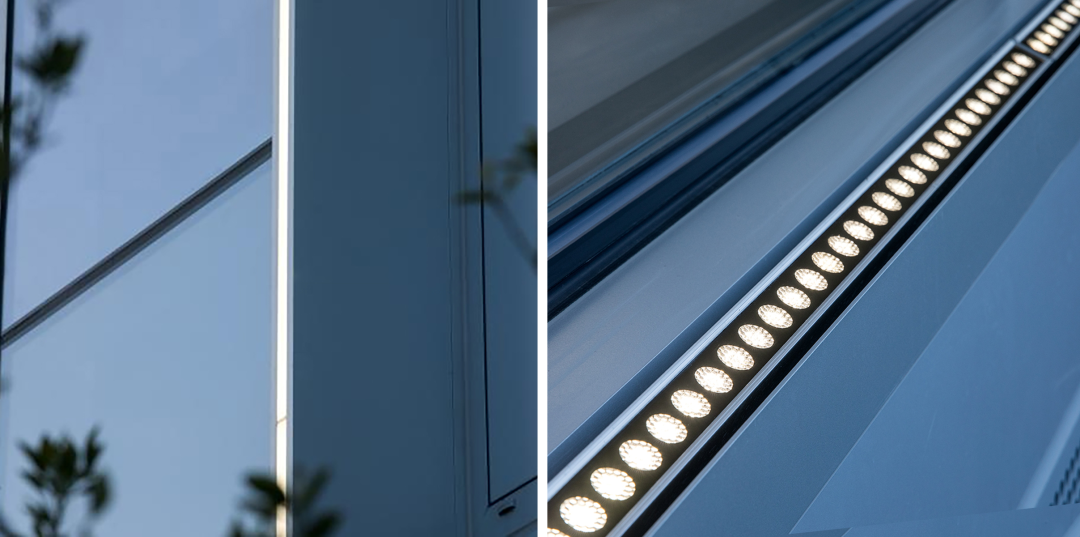 结合建筑“斗”形裂口与“荷”元素,通过灯光设计强化“磐石里的荷”意境。外立面GRC横向肌理采用线性洗墙灯渐变照明,模拟风化岩石的粗粝感;顶部“金荷大厅”弧形片墙通过隐藏式RGBW投光灯投射层叠光影,形成荷花从磐石中“生长”的视觉效果,夜间可编程实现“花瓣开合”动态场景。