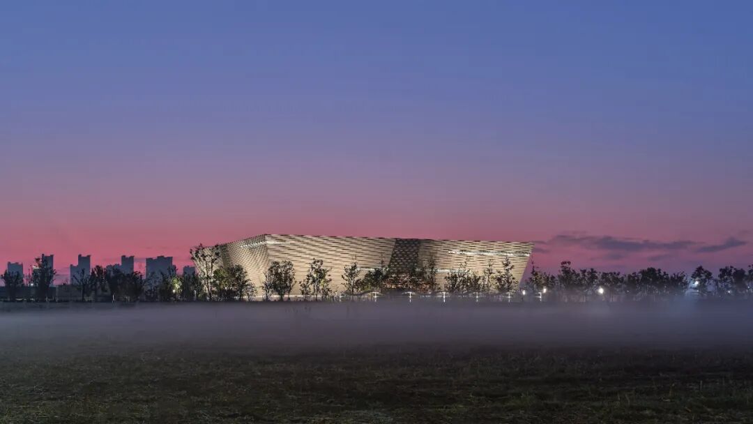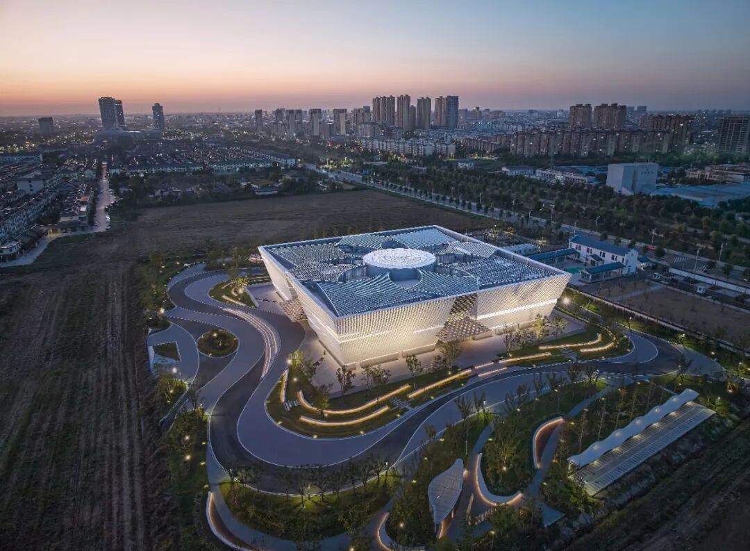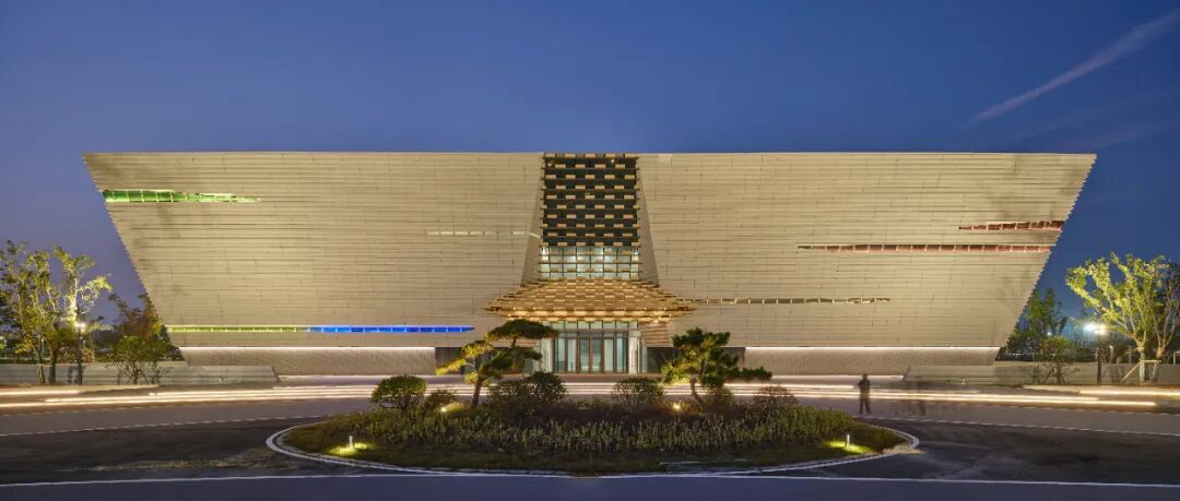 金湖县博物馆项目位于江苏省淮安市金湖县城南低碳生态新区内。荷花是金湖县的文旅名片, 每年夏日的赏荷活动都会吸引来大量的游客。因此,建筑设计将“荷”置入“斗”中,形成“斗生金荷”的设计概念。“荷”元素在建筑中分不同维度和层次展示,建筑外围的“斗”宛如古朴厚重的磐石。
