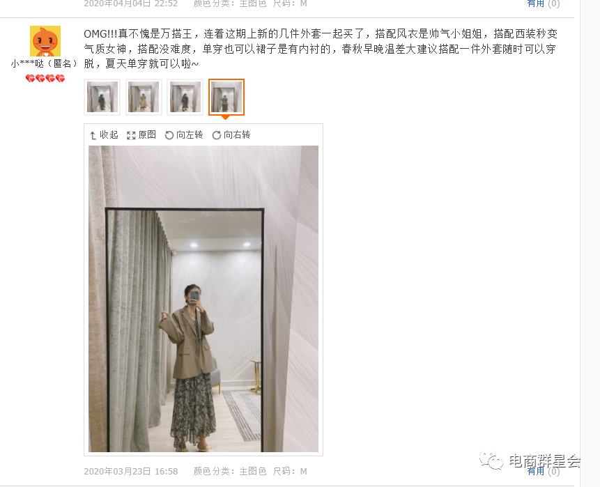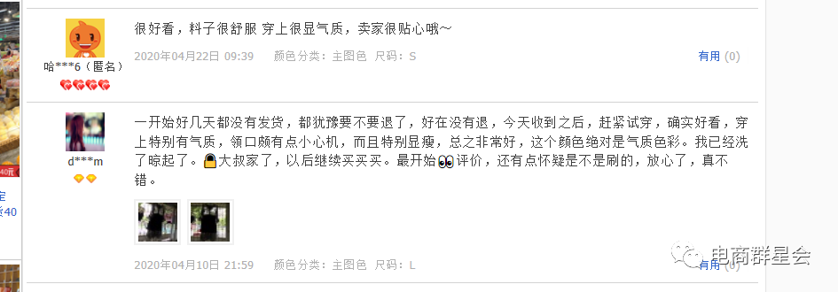 就比如图中的这个评价,“确实好看、有气质、小心机、显瘦”其实会更偏向于主观判断,看似好评,但其实对于其他用户的帮助并不是太大。还不如上面的评价说“料子穿着很舒服”,或者“面料不起球、不褪色”等等一些更客观的内容。