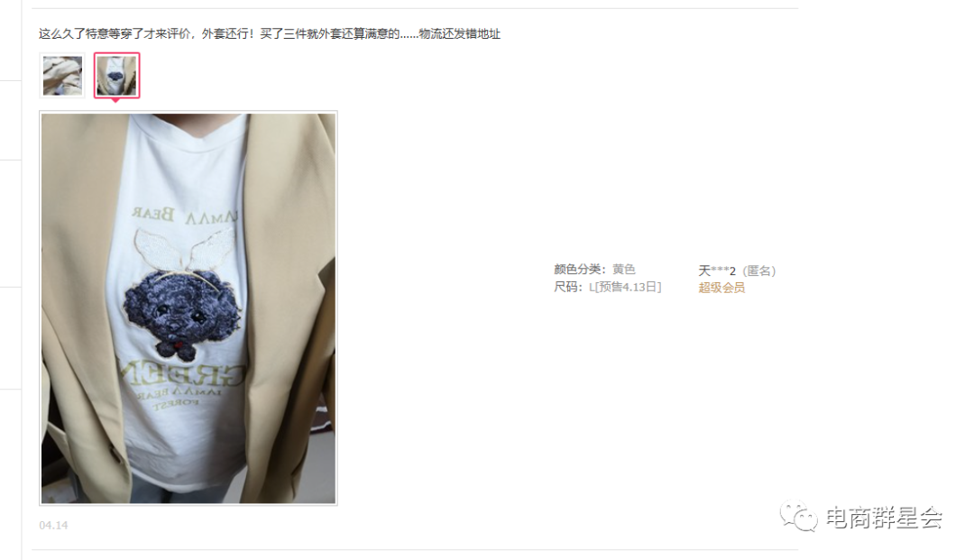 比如这个评价,表示外套还行,特意穿了很久来评价的,买了三件等等,这些都是在夸。但是后面有一个转折,即物流发错地址。这种看起来不知道是真的还是假的,半真半假才更能提高消费者的信任度。