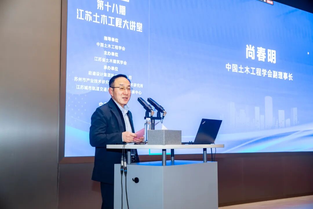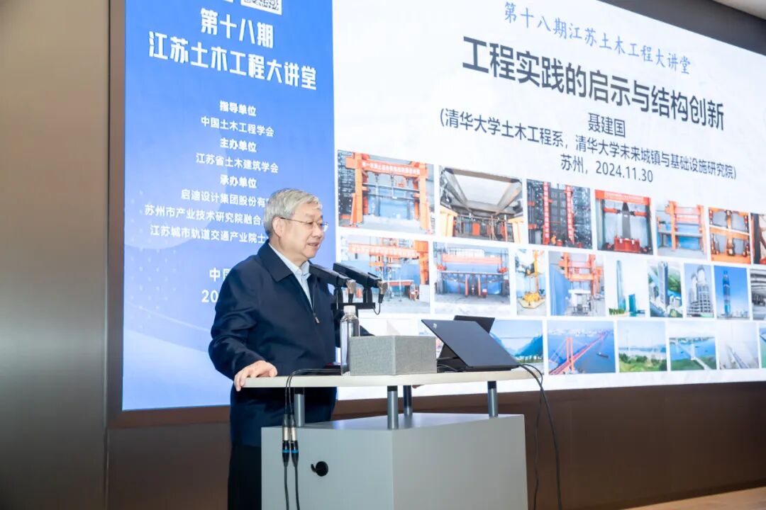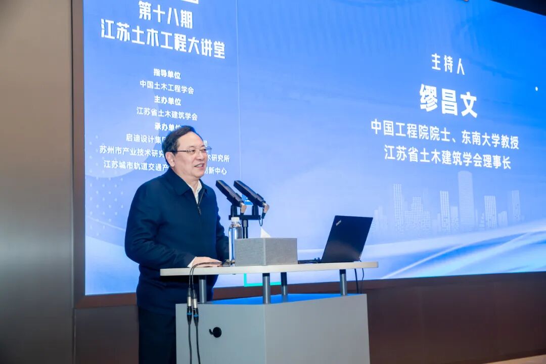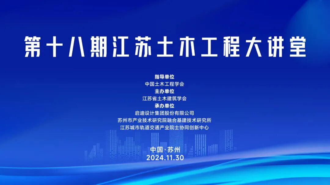 11月30日下午,第十八期江苏土木工程大讲堂在启迪设计大厦举行。会议邀请中国工程院院士缪昌文、中国工程院院士聂建国、中国工程院院士徐建、中国工程院院士曾滨等院士出席。中国土木工程学会副理事长尚春明、中国土木工程学会学术部部长包雪松、江苏省土木建筑学会副理事长王华、江苏省土木建筑学会秘书长卢红标等领导;江苏大学副校长王景全,东南大学教授、博士生导师刘松玉,苏州市产业技术研究院融合基建技术研究所所长李国建,以及启迪设计集团股份有限公司:党委书记、首席总工程师戴雅萍,董事长、首席总建筑师查金荣,副总裁、总工程师袁雪芬等嘉宾以及200多名行业专家及设计人员参加会议。