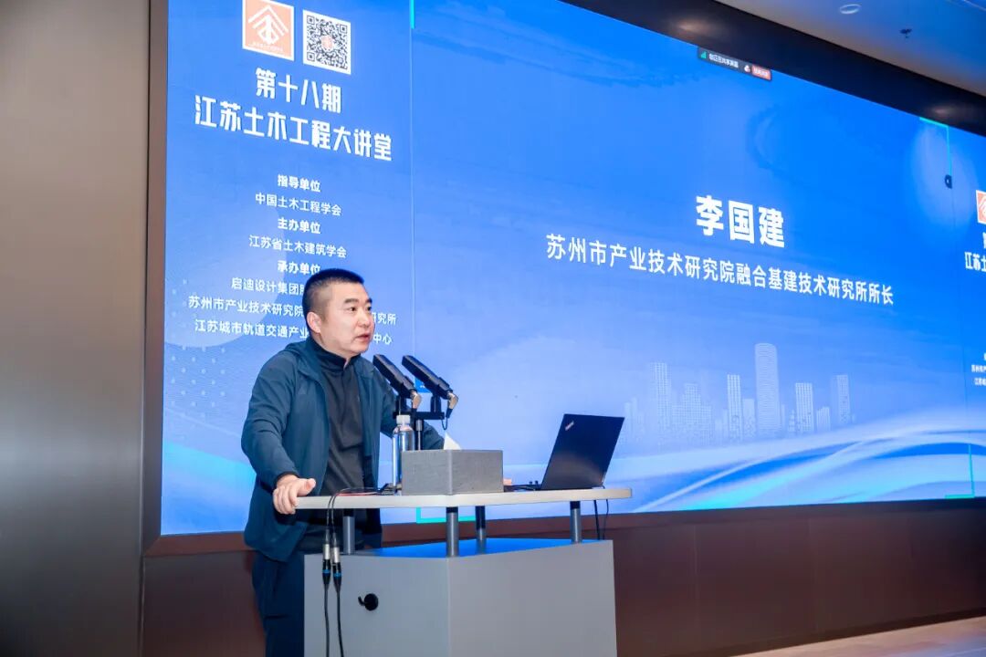 李国建所长就苏州市产业技术研究院融合基建技术研究所作为苏州市体制机制创新的重要探索实践作简要汇报。他表示,研究所是服务行业、团队主导、市场驱动的新型研发机构,是苏州创新平台建设改革的重大举措之一,是苏州产研院第一个切入新基建方向、走融合基建赛道的科研院所,成立至今得到了多位院士、专家的关心和支持;目前研究所已聚集近百名创新人才,获得了多项荣誉,正坚定不移地坚持研发作为产业,科技作为产品的理念,从市场中来,到市场中去;近年来研究所已探索出一条平台共建、资源共享、生态共生、合作共赢的发展路径,致力于实现数据驱动、以人为本、绿色低碳三大价值导向,打造更多有用、好用、广泛用的智能建造体系化产品。
