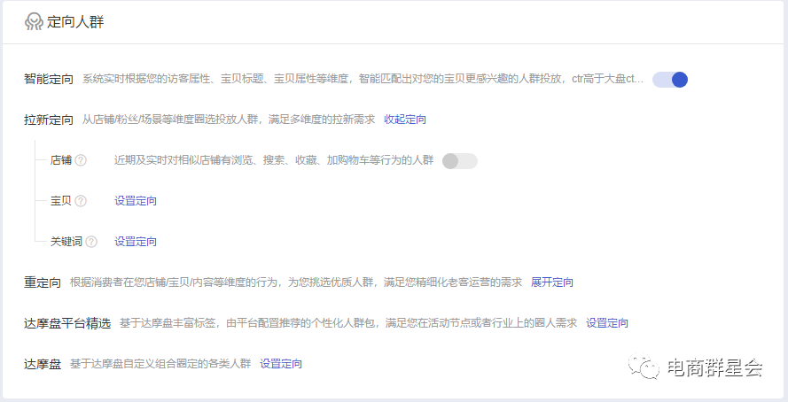 店铺自身人群标签比较精准的情况下,店铺拉新首选智能定向人群(系统实时根据您的访客属性、宝贝标题、宝贝属性等维度,智能匹配出对您的宝贝更感兴趣的人群投放)。