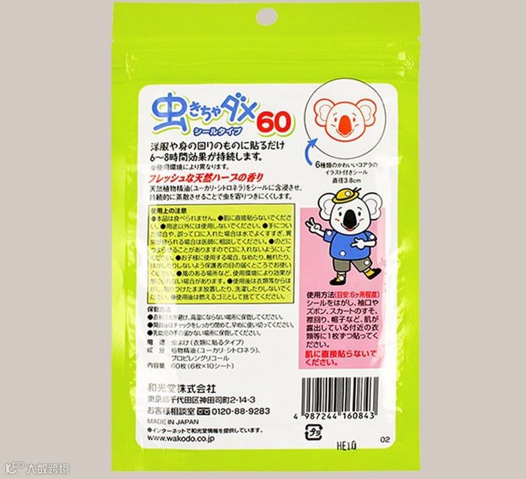 原装进口防蚊贴一共60枚,用的时候揭下来一贴贴在宝宝衣服或者身上即可,包装带上有说明,适合孕妇新生儿及以上的宝宝使用,是天然精油调和而成,不含有毒有害物质。